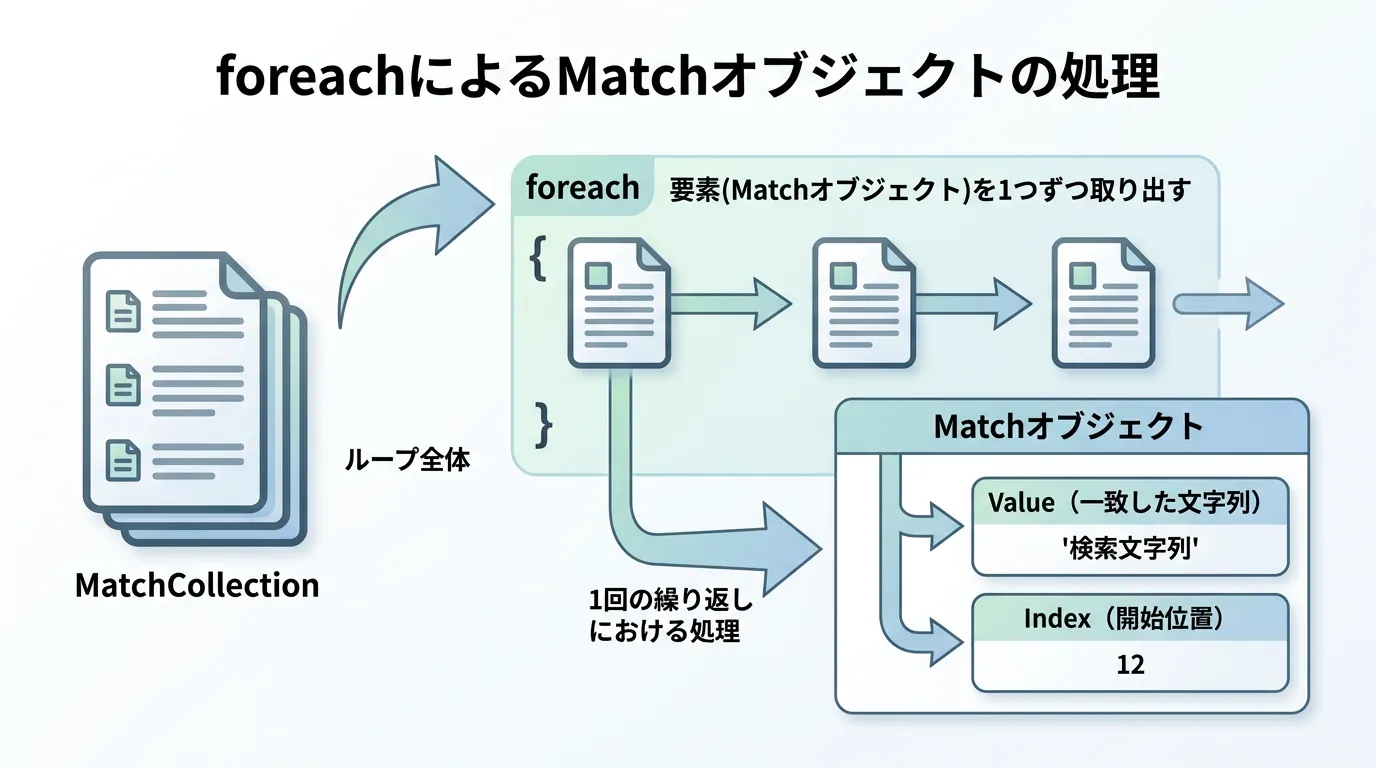 ここで重要なのは、MatchCollectionは遅延評価(Lazy Evaluation)に近い挙動を示すという点です。