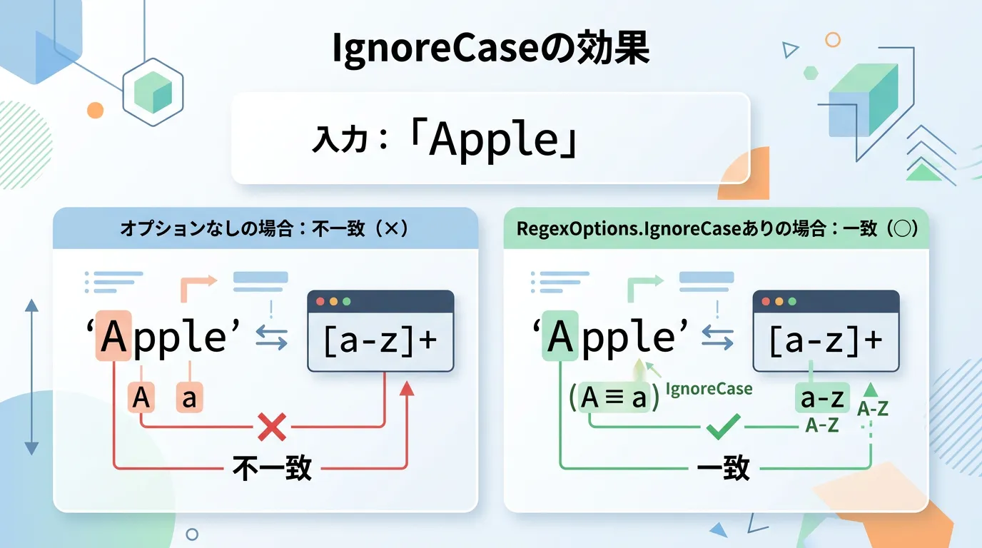 RegexOptions.IgnoreCase大文字と小文字を区別せずに検索します。