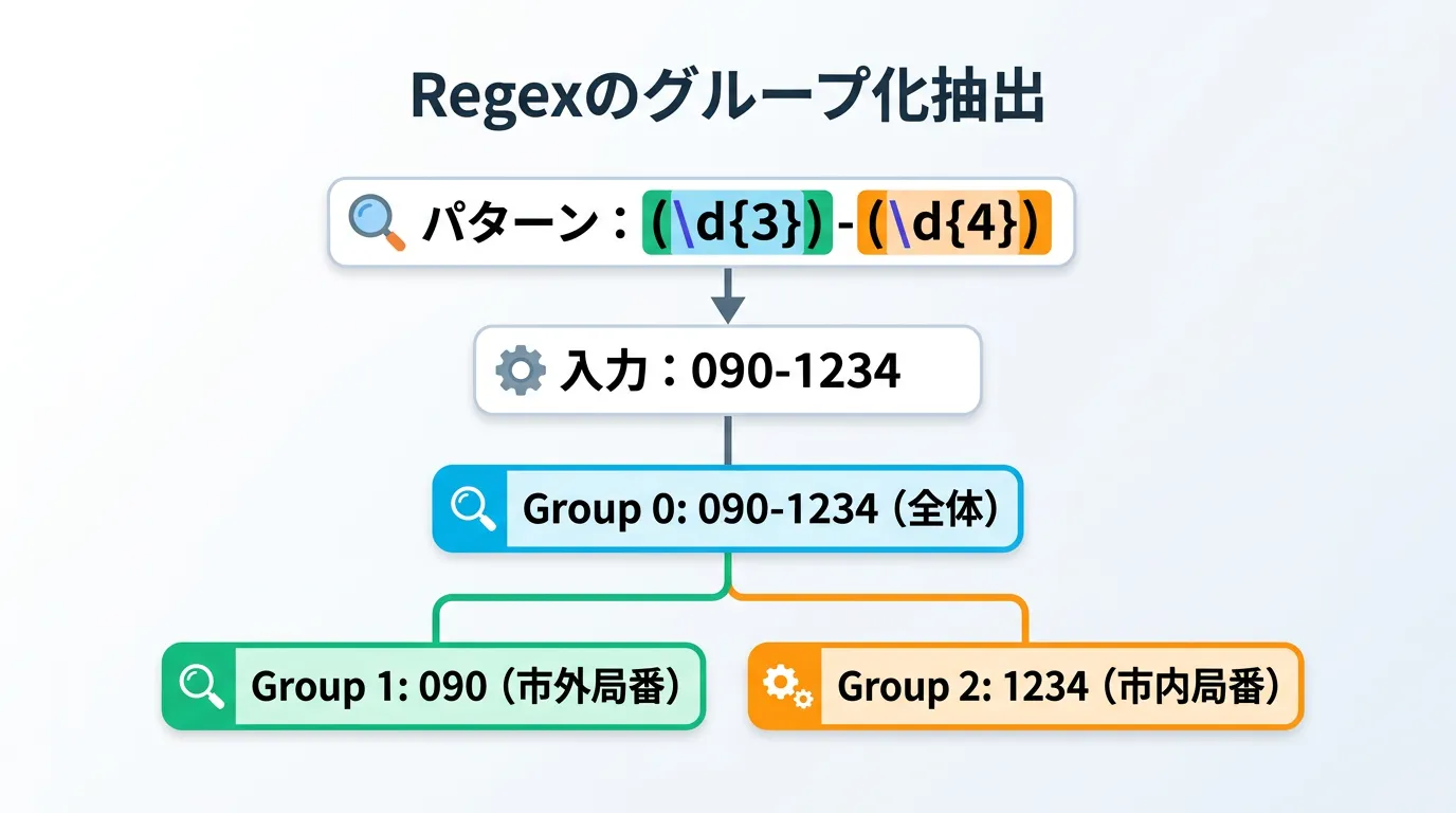 これを利用することで、複雑な文字列構造の中から特定のデータ(日付の「年」の部分だけ、URLの「ドメイン」の部分だけなど)をピンポイントで抽出することが可能です。
