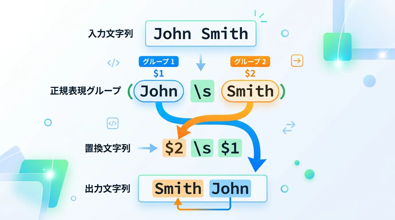 正規表現置換の真骨頂は、パターンの中で一致した特定の部分を 置換後の文字列に再利用できる 点にあります。