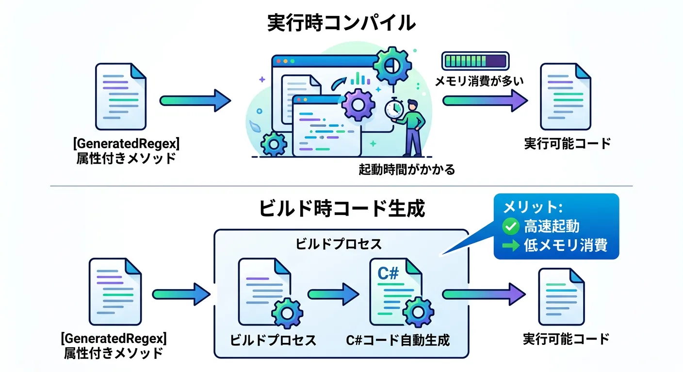 従来の RegexOptions.Compiled も有効ですが、現在は Source Generator を活用した手法が推奨されています。