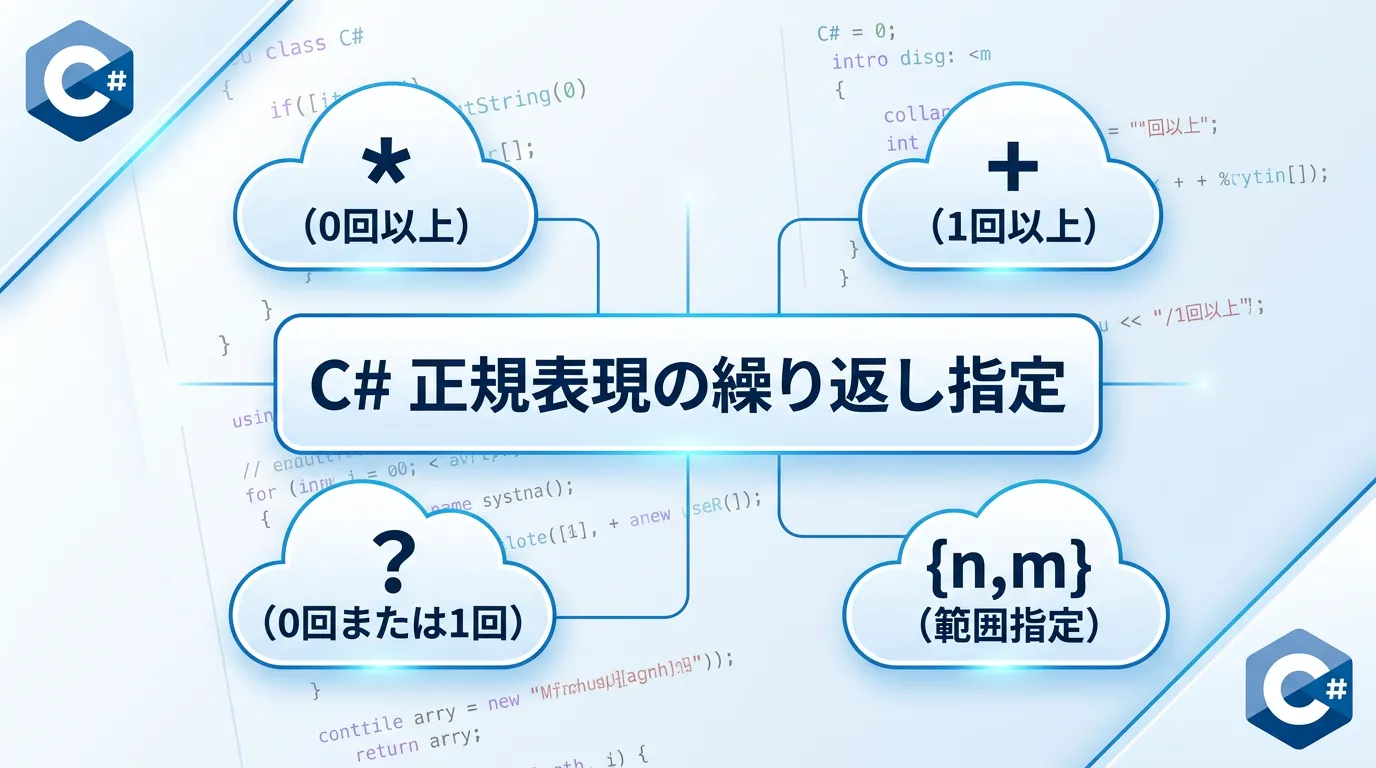 本記事では、C#のSystem.Text.RegularExpressions名前空間を利用して、正規表現で繰り返し回数を指定するさまざまな方法を、基礎から最新の最適化手法まで詳しく解説します。