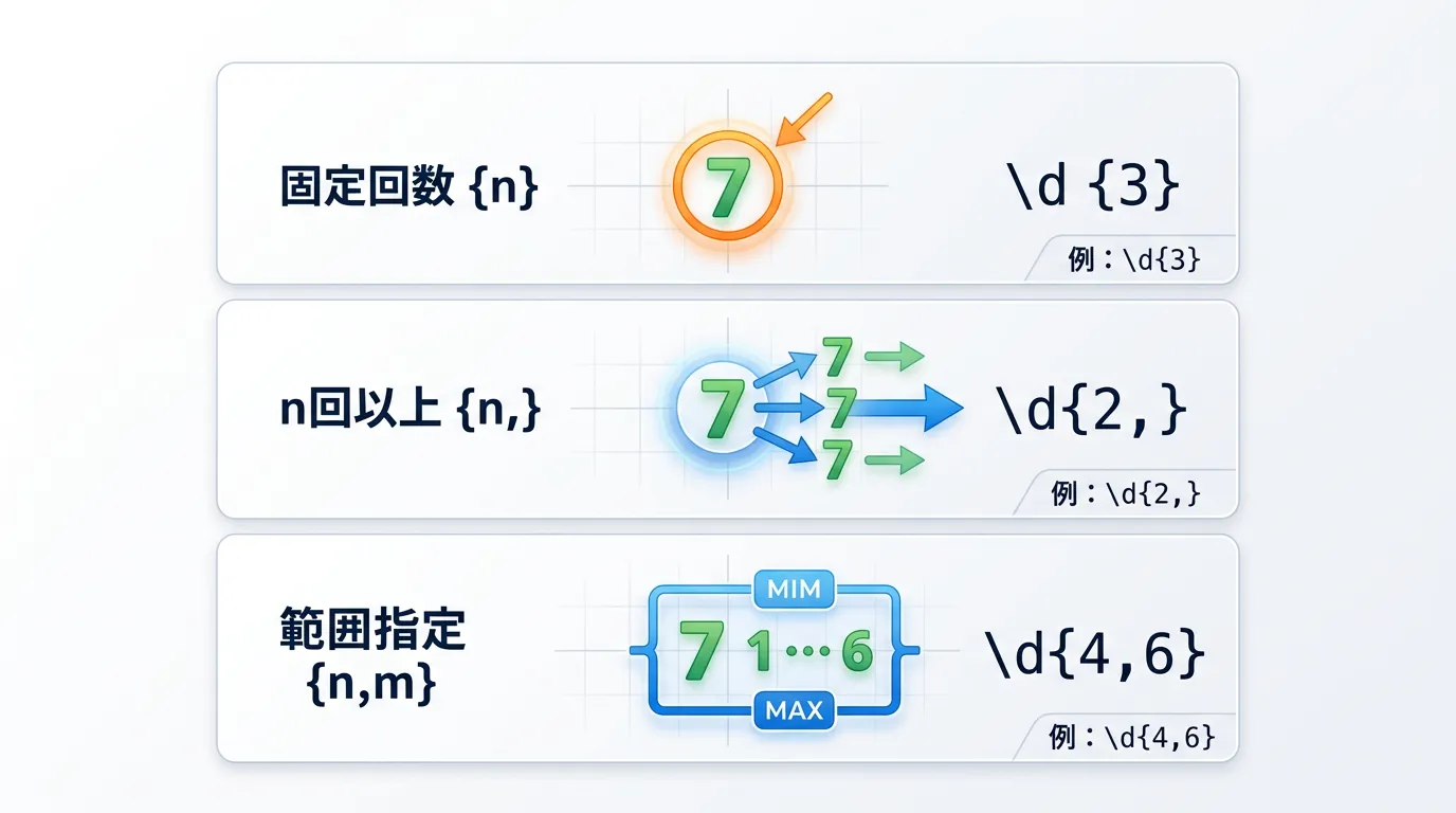 特定の回数だけ繰り返したい、あるいは「3回以上5回以下」のように範囲を制限したい場合には、{n,m} という形式の量指定子を使用します。
