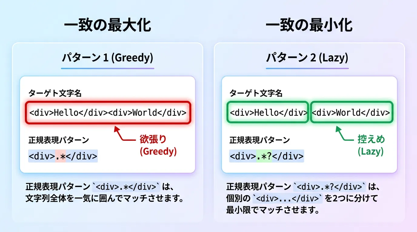 正規表現の繰り返し指定を扱う上で、必ず理解しておかなければならないのが「欲張りなマッチ (Greedy Match)」と「控えめなマッチ (Lazy/Non-greedy Match)」の違いです。