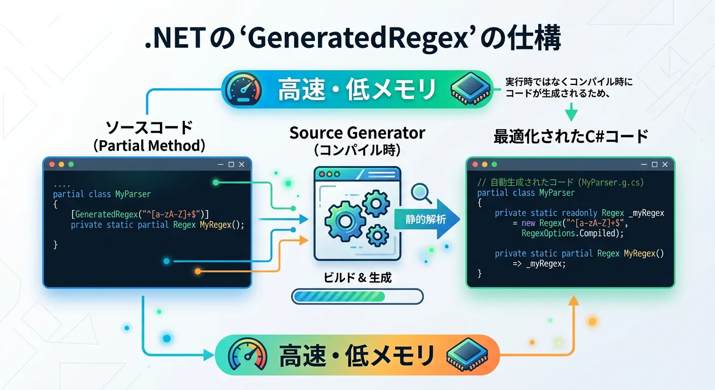 .NET 7 以降では、ソースジェネレーターを利用した新しい正規表現の最適化手法 GeneratedRegex が導入されました。