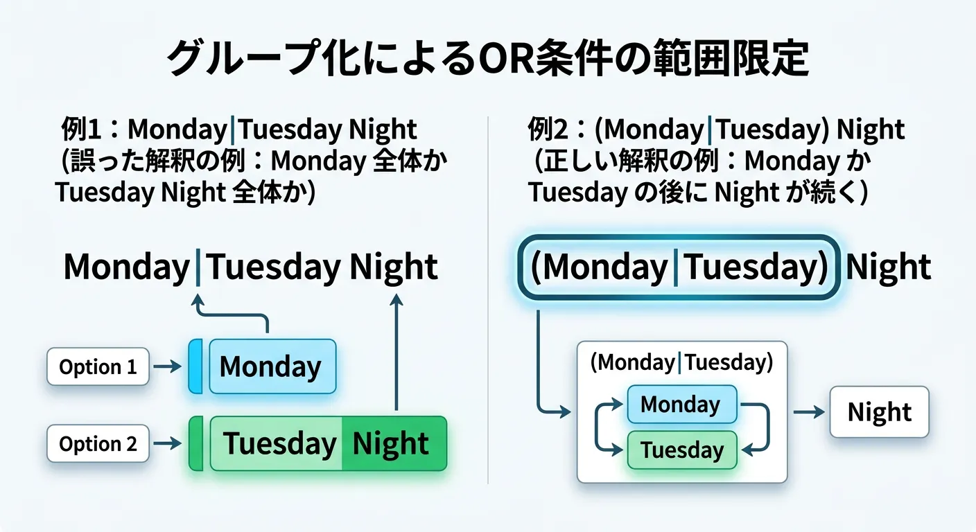 例えば、「Monday Night」または「Tuesday Night」に一致させたい場合、Monday|Tuesday Night と書くと、意図に反して「Monday」または「Tuesday Night」という解釈になってしまいます。