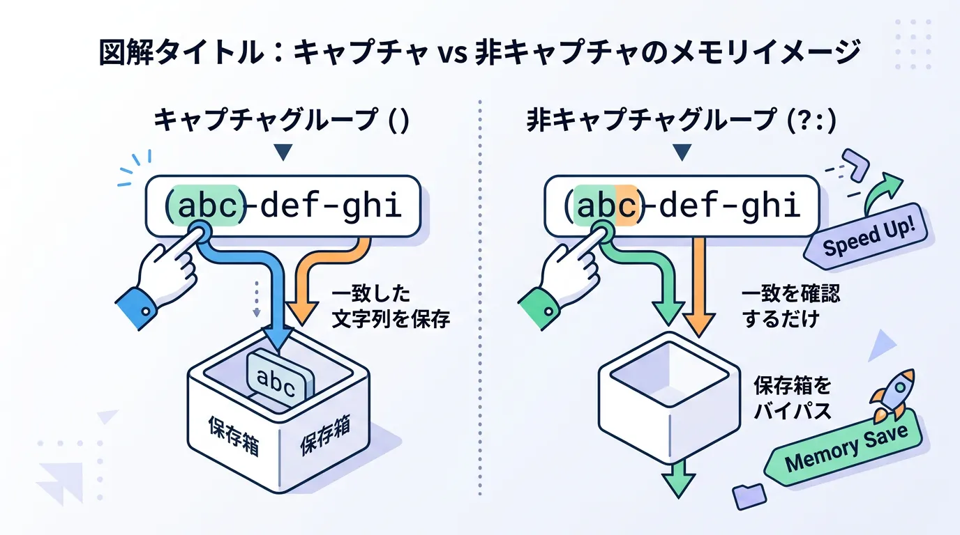 大量のテキストデータを処理する場合や、ループ内で頻繁に正規表現を実行する場合は、この (?:...) を積極的に活用することで、アプリケーションのパフォーマンス向上が期待できます。