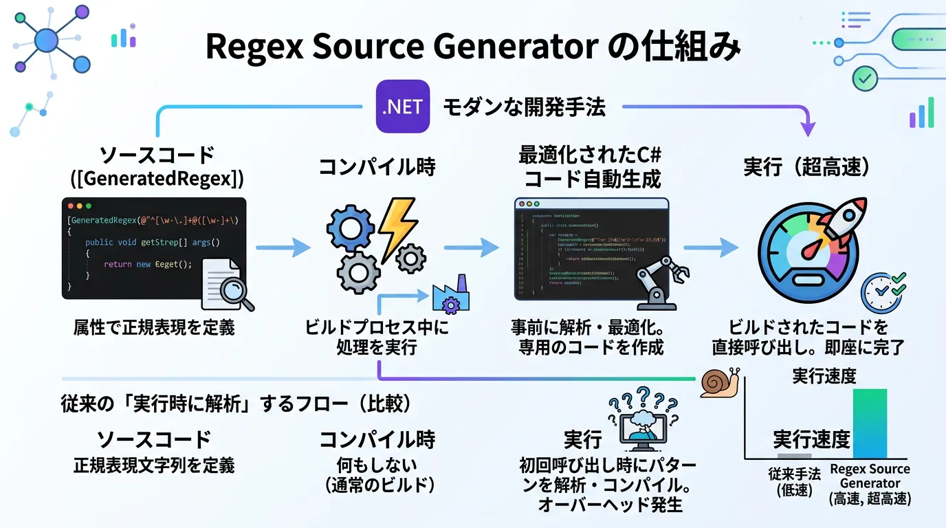 これまでの Regex クラスは、実行時にパターンを解析していましたが、Source Generator を使用すると、コンパイル時に正規表現の解析コードを生成します。