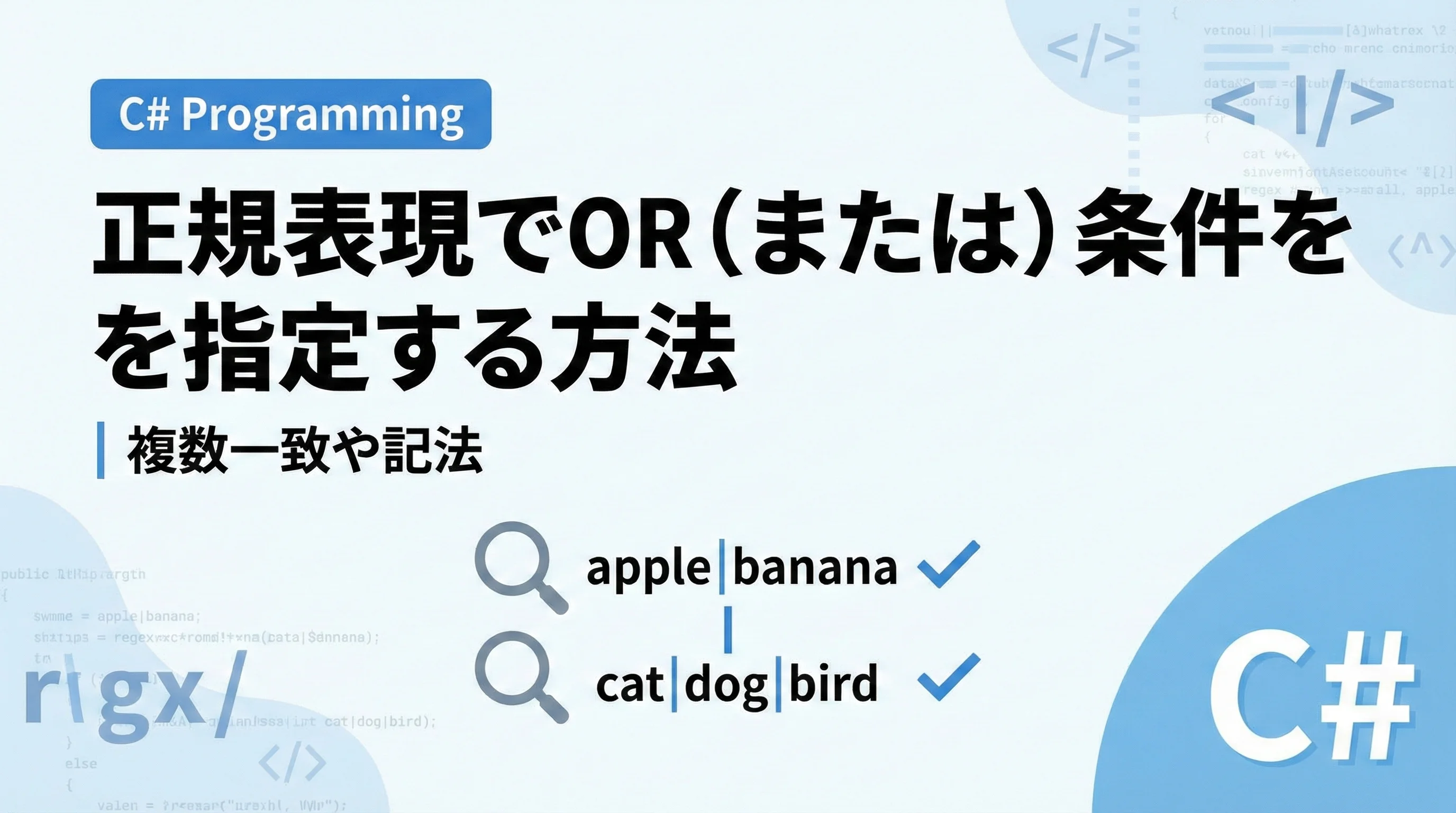 C#における正規表現のOR条件は、パイプ記号 | とグループ化 () を組み合わせることで、非常に柔軟なパターンマッチングを実現します。