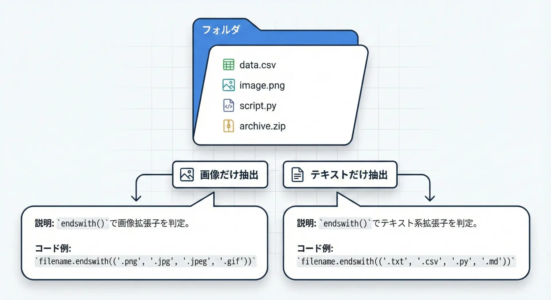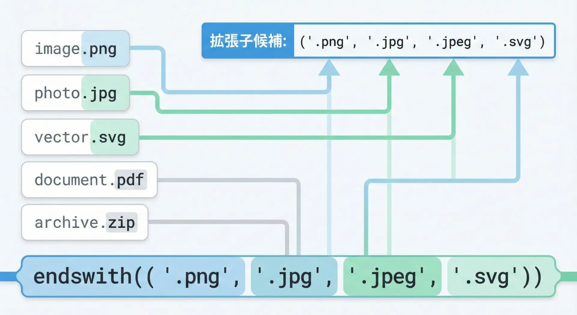 このように、拡張子一覧をタプルでまとめておき、endswithで一括判定すると、拡張しやすく保守もしやすいコードになります。