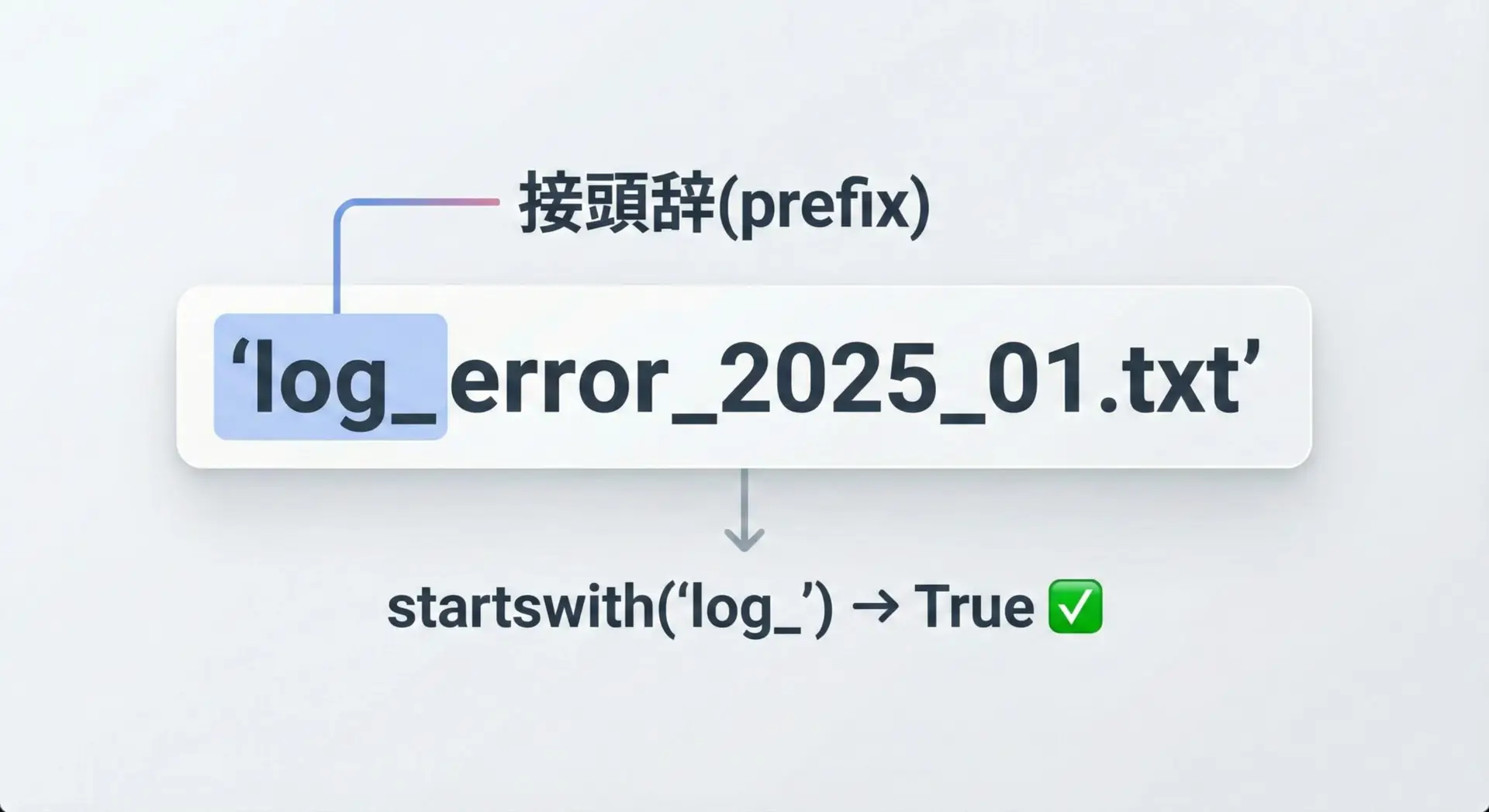 Pythonのstartswithとendswithは、文字列の「先頭」または「末尾」が、指定した文字列(プレフィックスやサフィックス)と一致しているかどうかを調べるためのメソッドです。