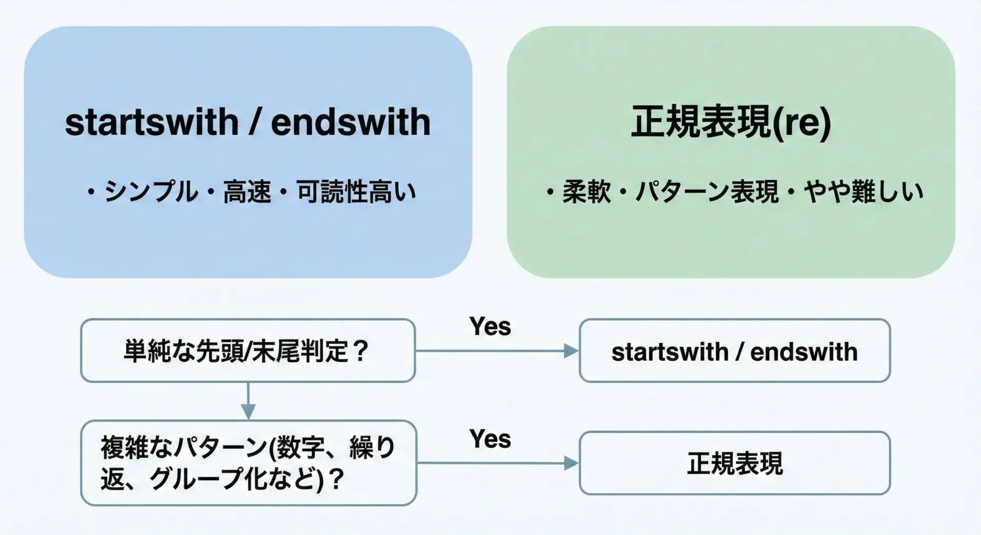 startswith / endswith と正規表現(reモジュール)は、どちらも文字列パターンの判定に使われますが、目的と得意分野が異なります。