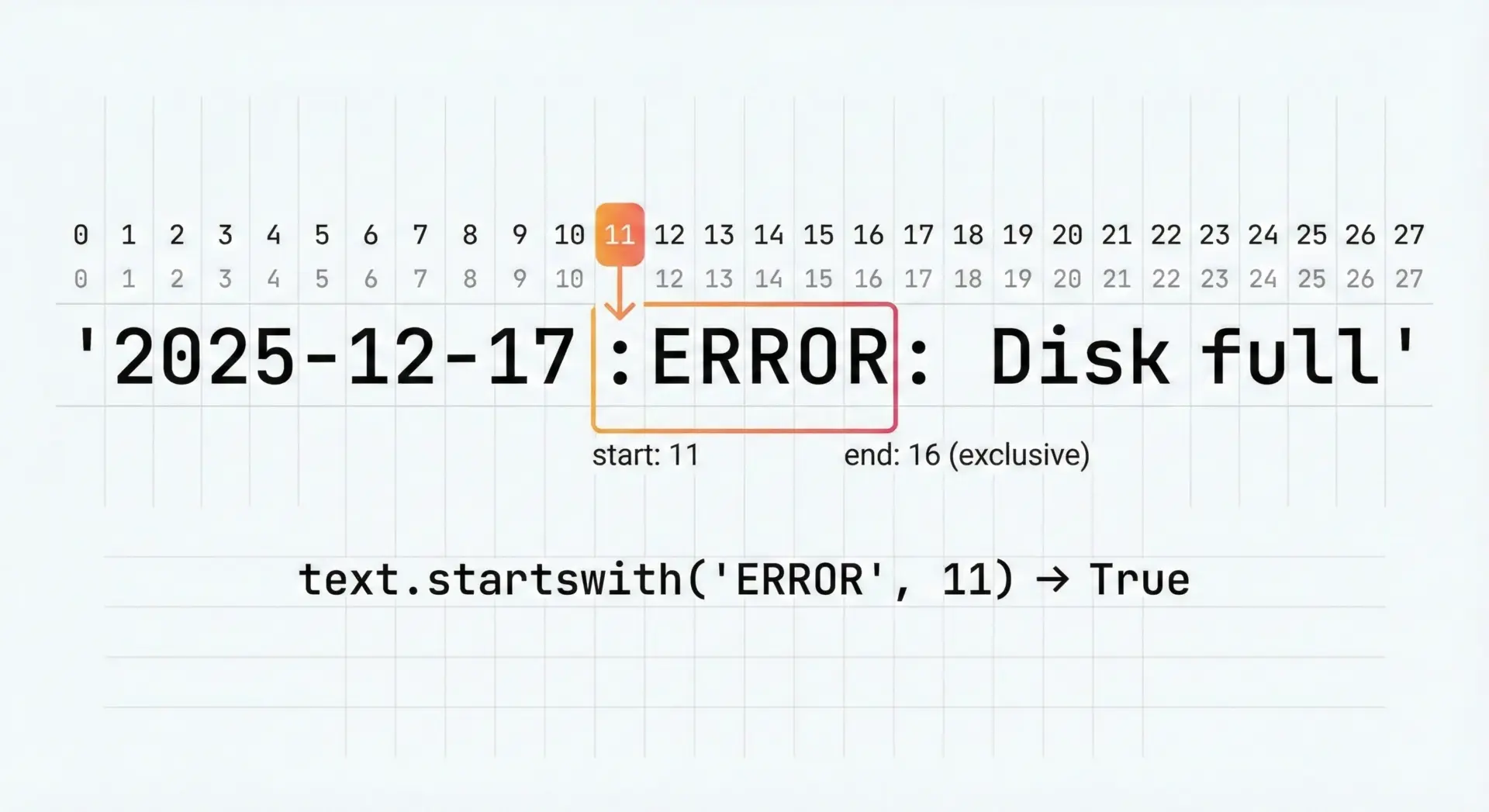 startswith(prefix, start, end)と書いた場合、文字列の[start:end]スライスの「先頭」がprefixと一致するかどうかを判定します。