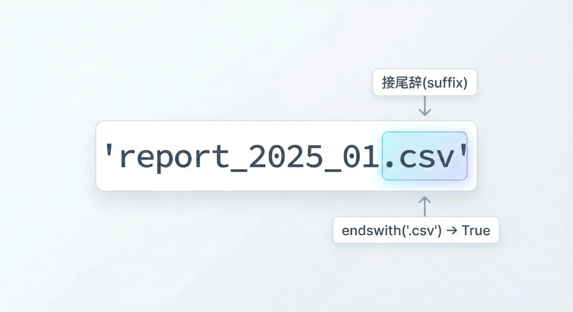 endswithは文字列の末尾が、指定した接尾辞(サフィックス)と一致するかどうかを判定します。