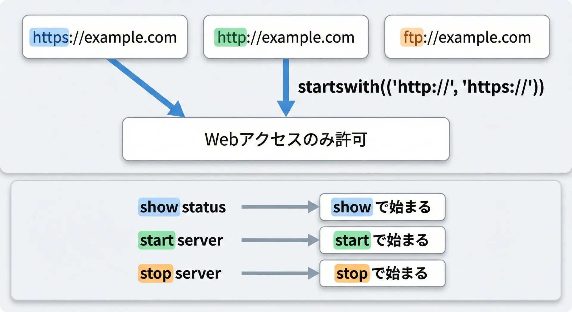 startswithは、URLスキームやコマンド種別の判定にもよく使われます。