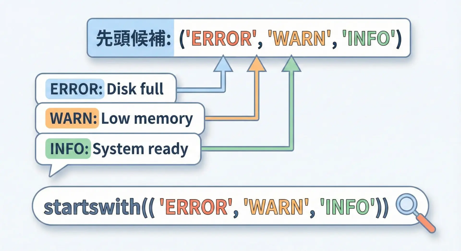 このように、startswithはファイル種別やメッセージ種別などを簡単に判定するのに適しています。