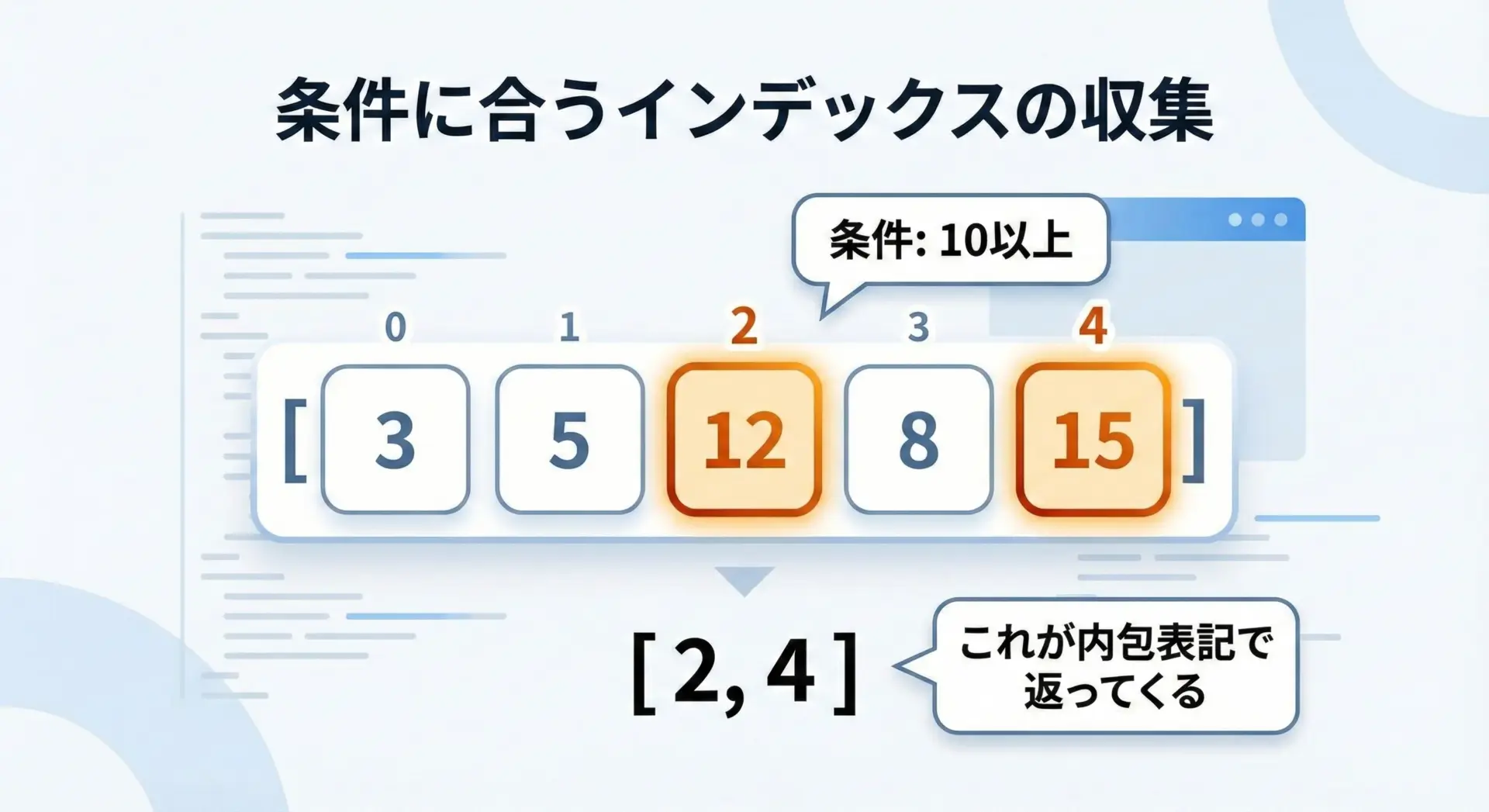 list.indexは最初の1件しか返しませんが、実務では「すべての位置が欲しい」というケースも多くあります。