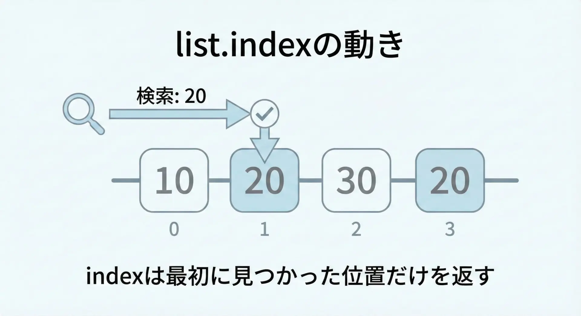 このようにnumbers.index(20)は1を返しますが、後ろにある20(インデックス3)は無視されます。