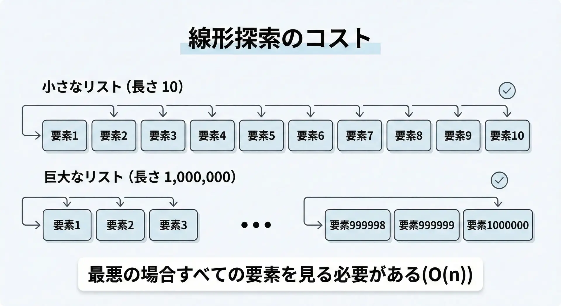 リストが小さいうちは問題ありませんが、要素数が数十万〜数百万を超えると、何度も線形探索をするのはコストが高くなります。