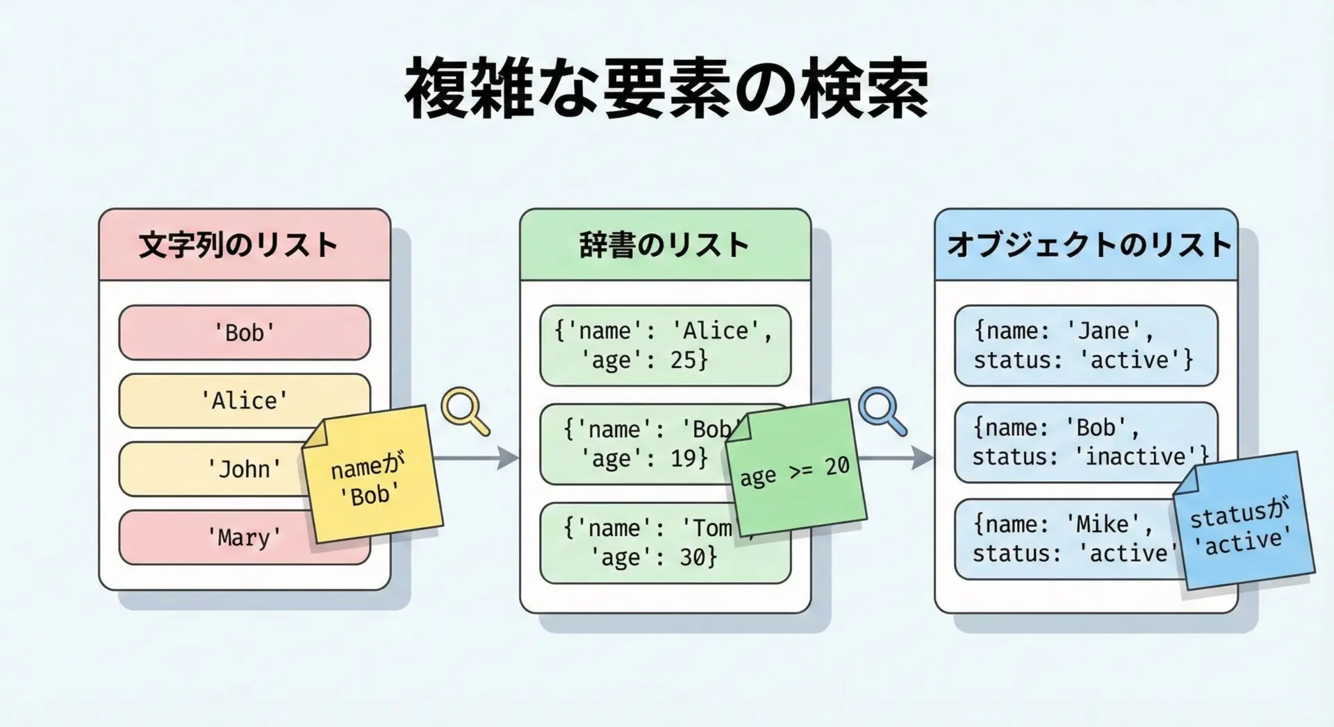 本記事のサンプルをベースに、自分のプロジェクト向けの検索ヘルパー関数や逆引きインデックスを整備しておくと、今後のPython開発がぐっと快適になります。