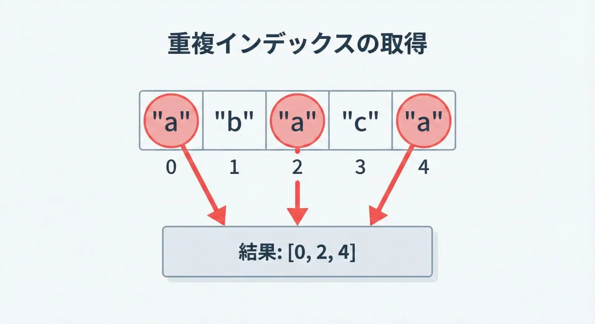 次に、同じ値が複数回登場するリストで、すべてのインデックスを取得する方法を整理します。
