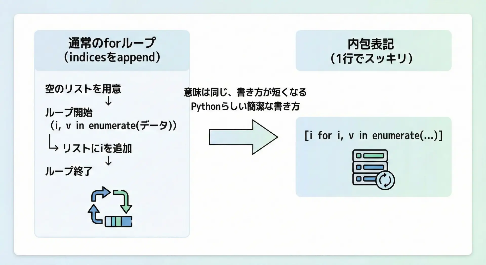Pythonのリストからインデックスを取得する方法は、基本のlist.indexから始まり、forループ、enumerate、リスト内包表記、条件付き検索、逆引き辞書、ユーティリティ関数化まで幅広く存在します。