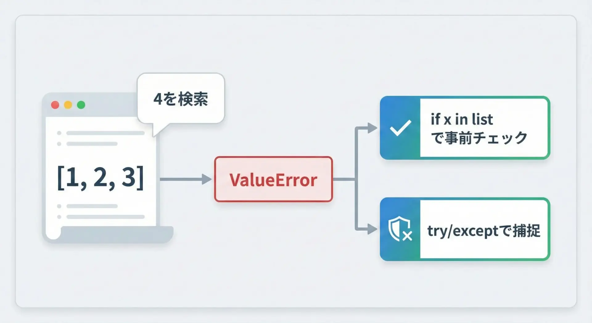 見つからない時のエラー(ValueError)対策と回避方法