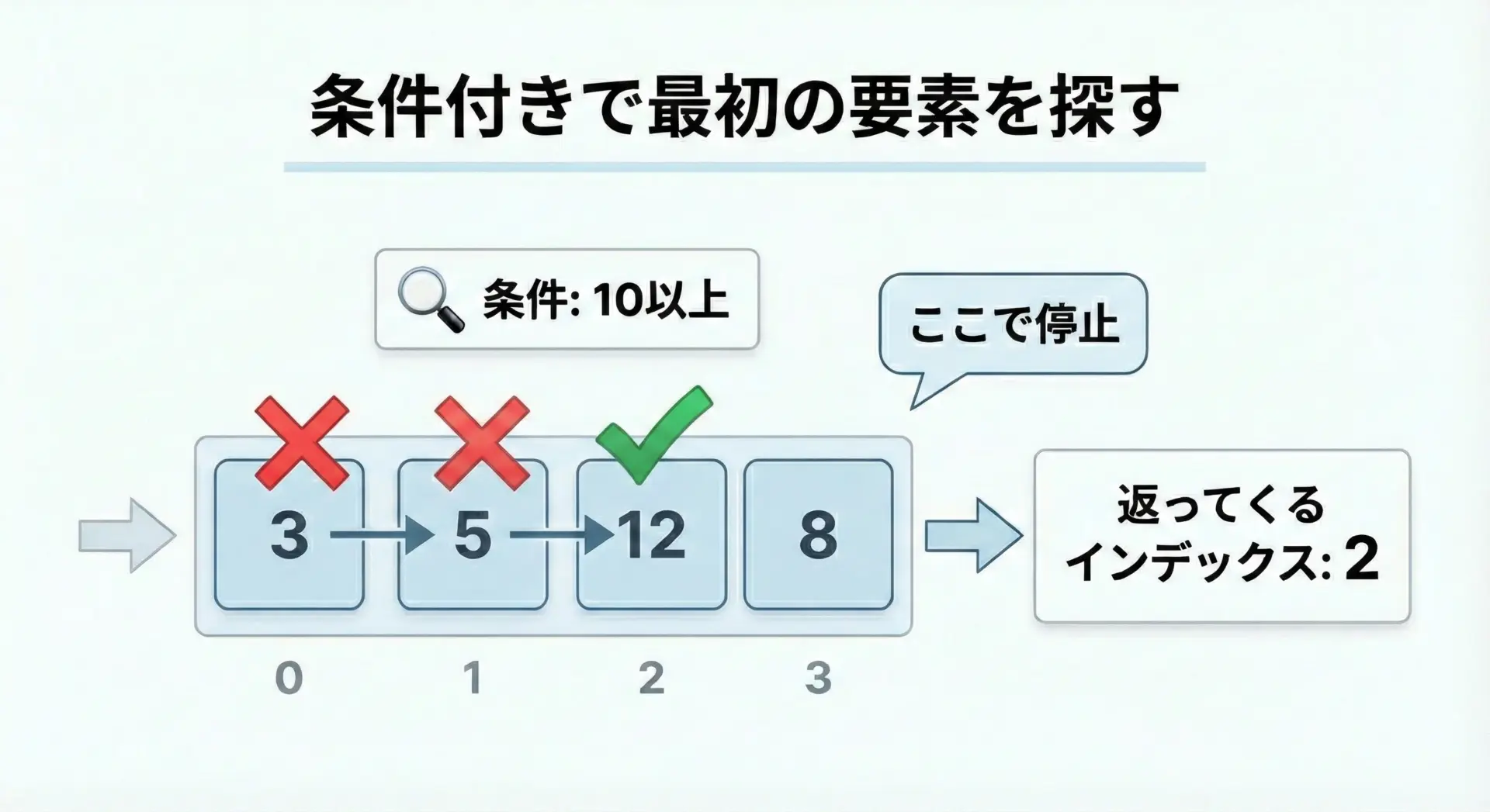 条件を満たす最初の要素のインデックスを返す。