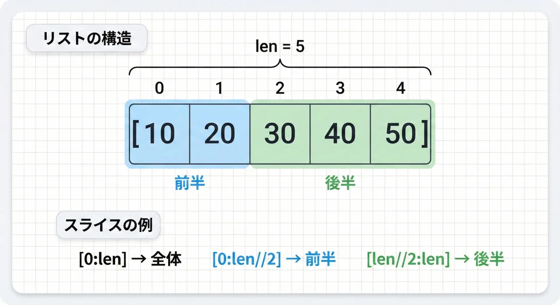 このように、lenを使うことで「リストの長さに依存した柔軟な範囲指定」が可能になります。