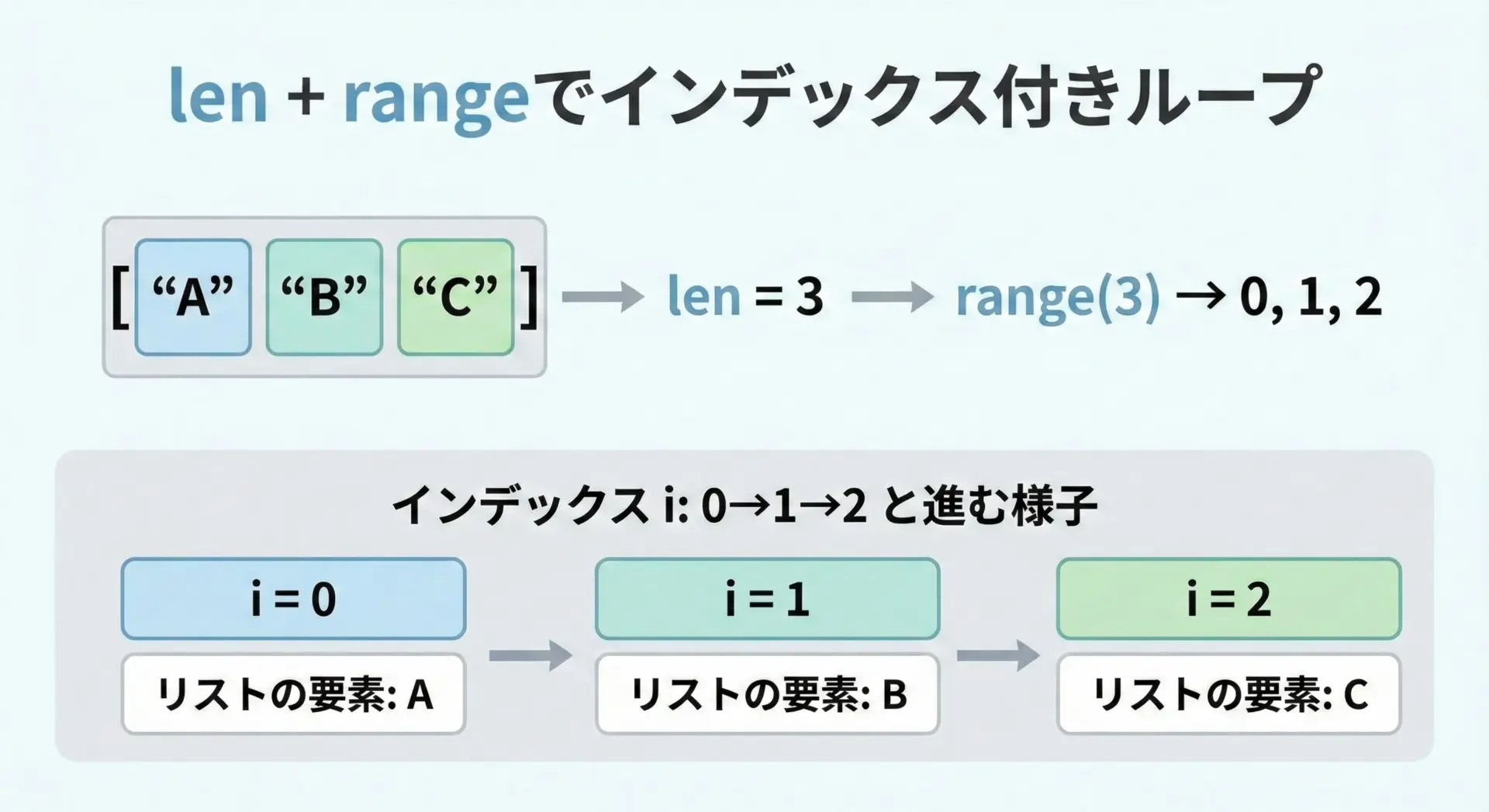 Pythonではfor 要素 in リストという書き方が基本ですが、インデックスも一緒に扱いたい場面ではlenとrangeを組み合わせたループが利用されます。