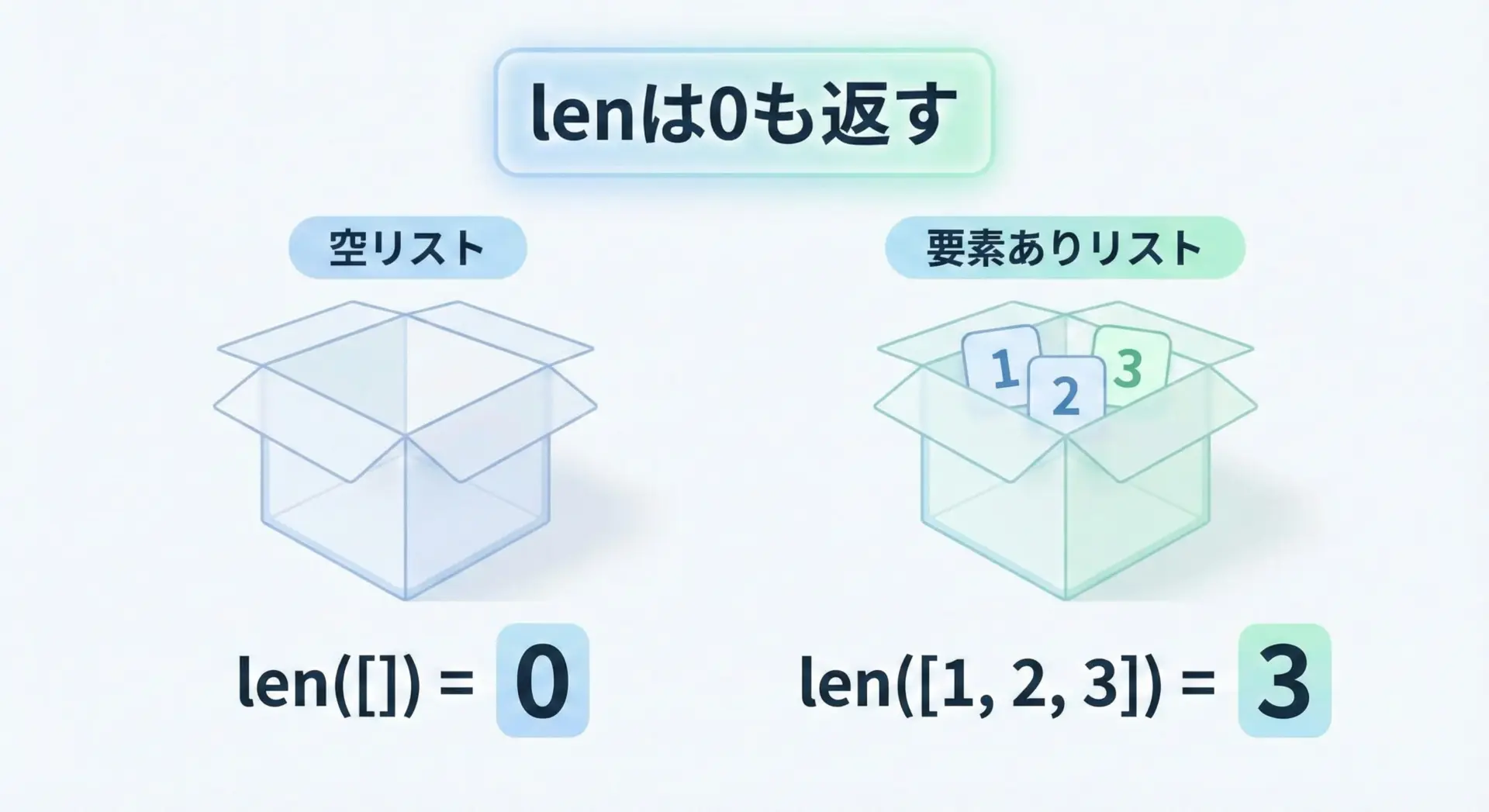 ただし、「要素数が0かどうか」ではなく「具体的な数値条件」を見たいときは、もちろんlen(list)を使うべきです。