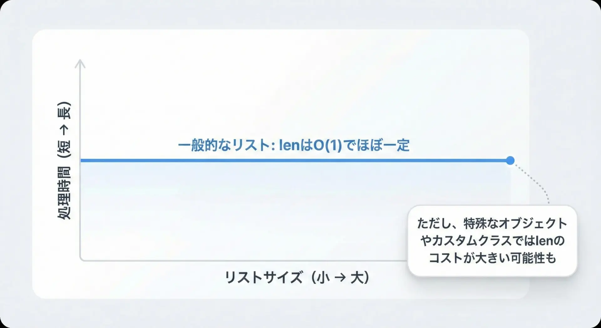 通常のPythonリストに対するlen(list)はO(1)(要素数に関わらない一定時間)で動作するため、数百万要素のリストでもlen自体がボトルネックになることはほとんどありません。