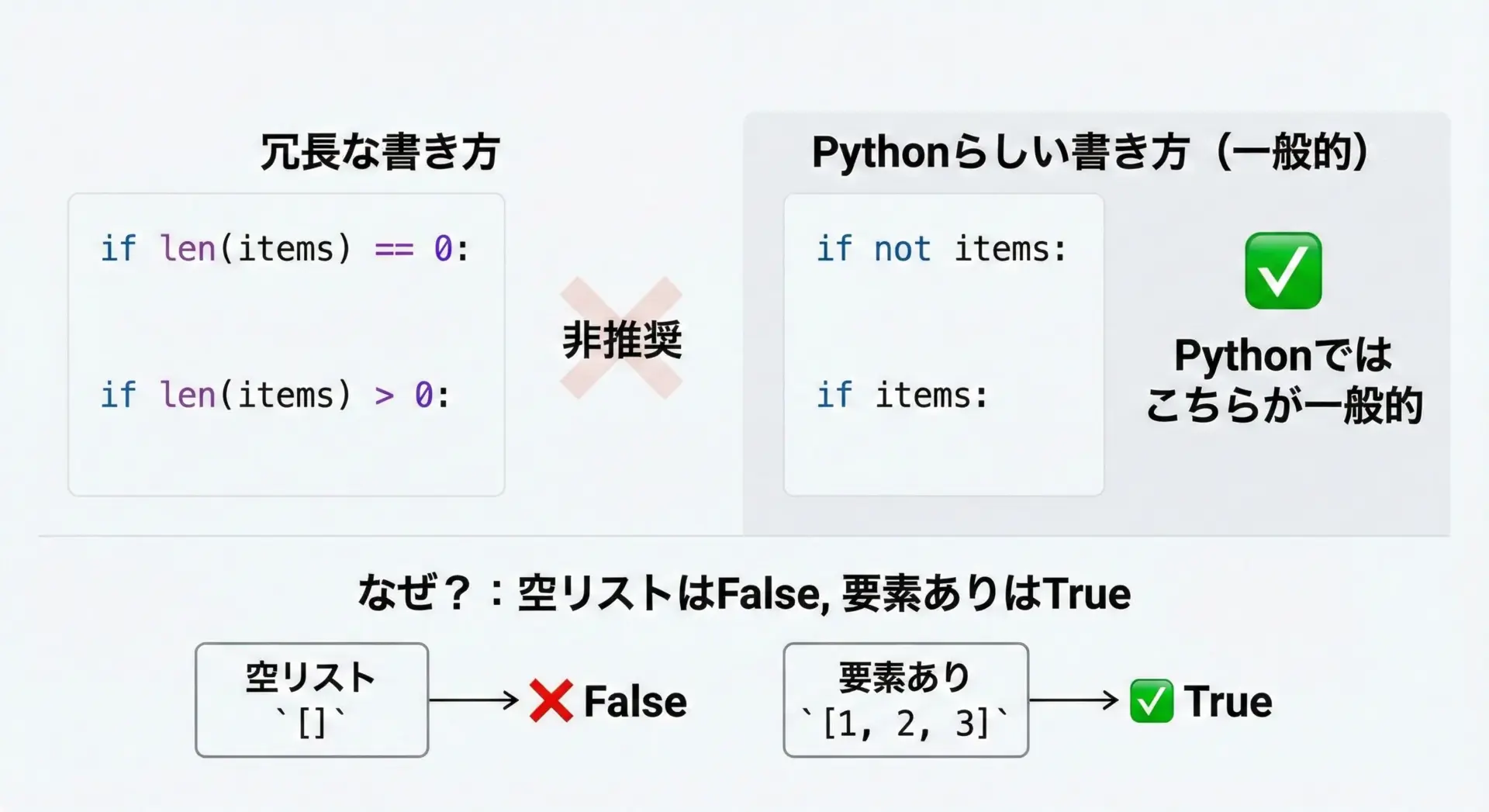 空のリストはFalse、要素が1つ以上あるリストはTrueとして扱われるため、if items:やif not items:という書き方が自然です。