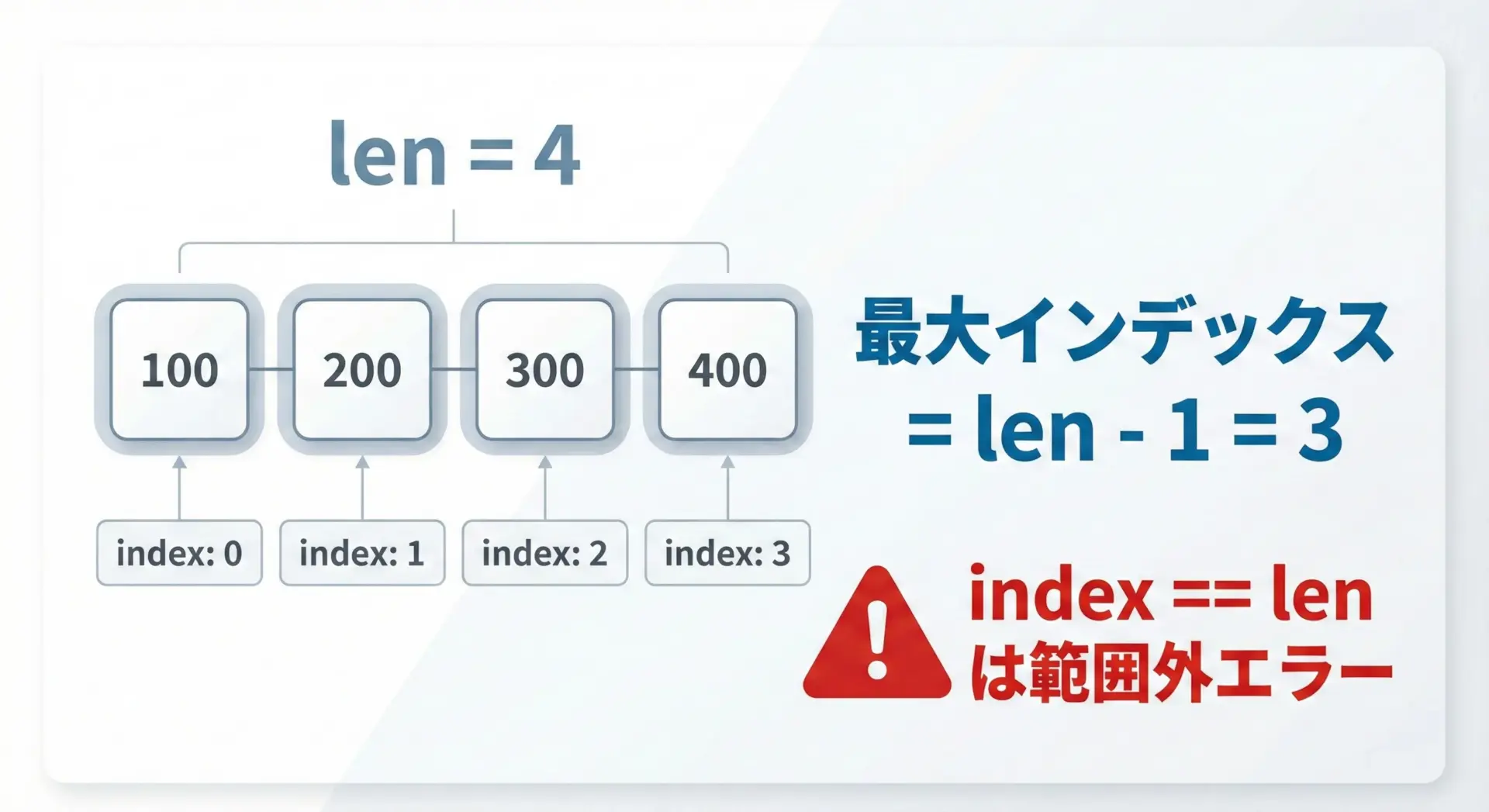lenが返す値と、インデックスの最大値は1違うという点は、特に初心者がつまずきやすいポイントです。