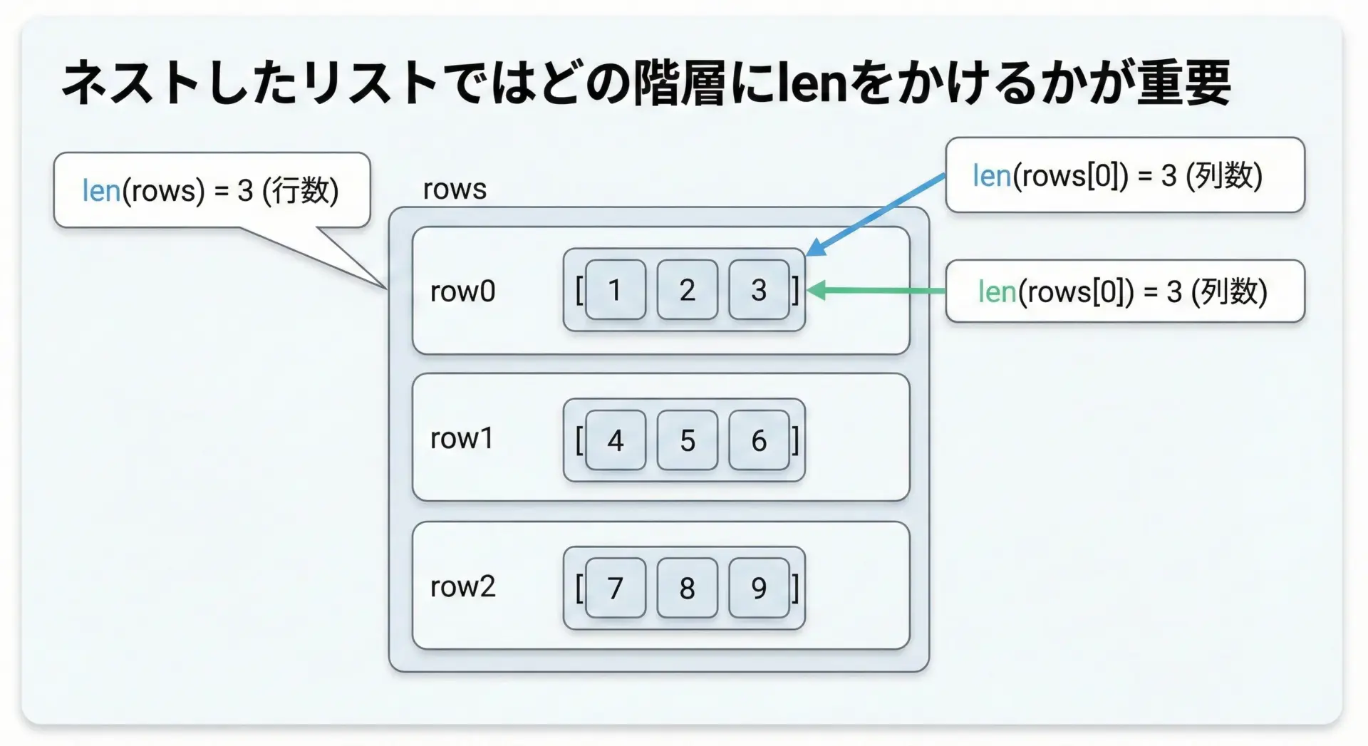 このように、外側のリストに対するlenは「行数」、内側のリストに対するlenは「列数」というイメージになります。