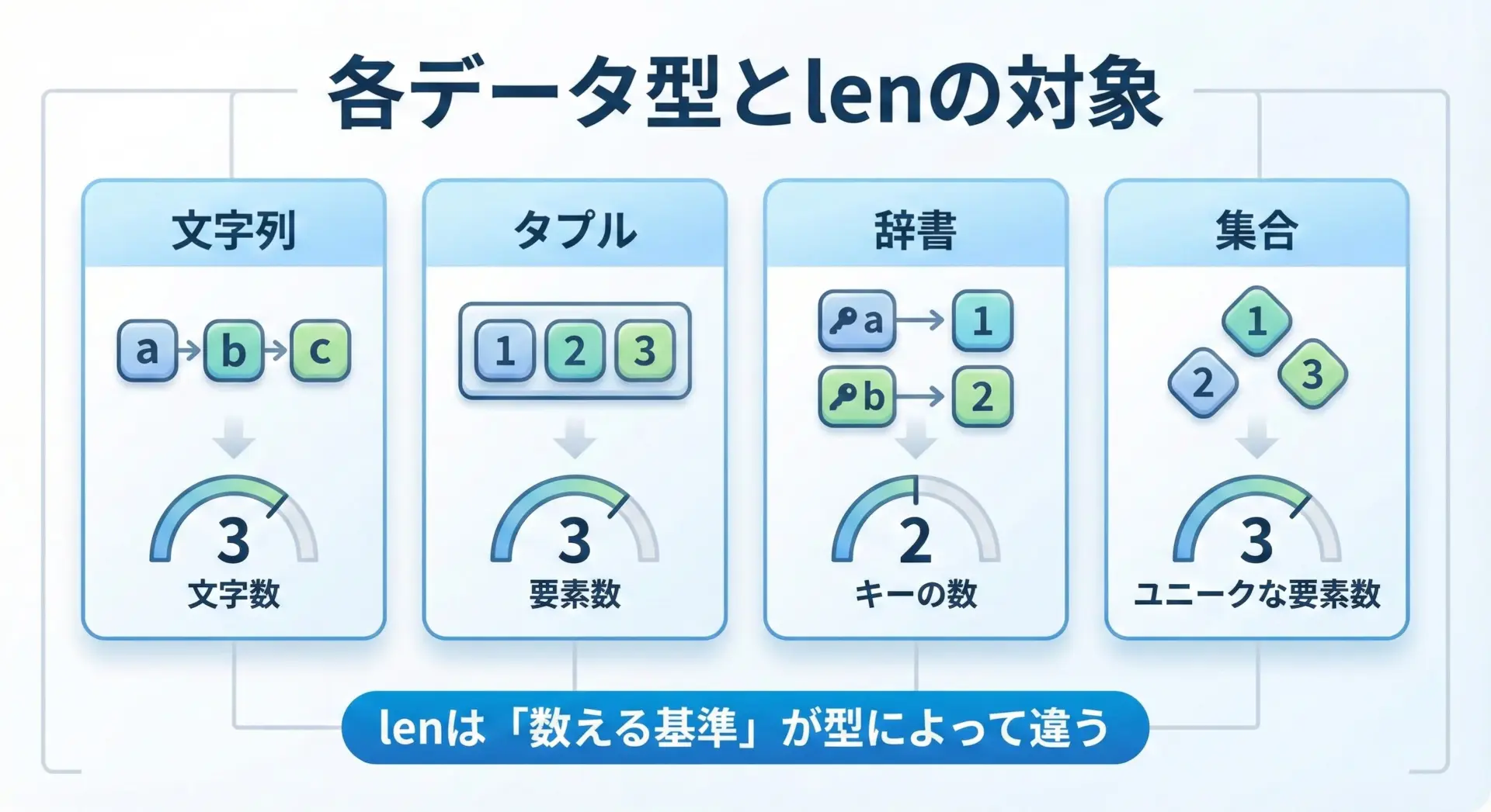 lenはリスト以外のオブジェクトにも使えますが、「何を数えているか」は型によって異なります。