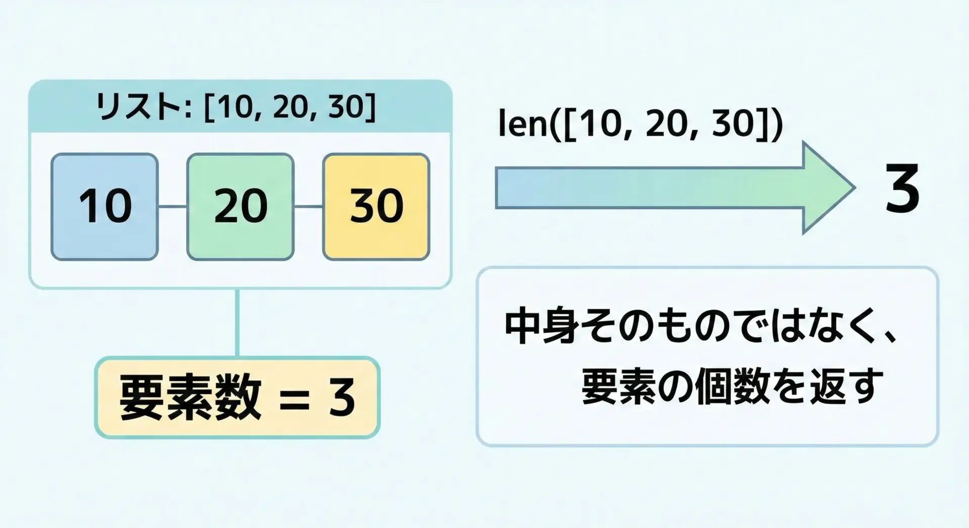 lenは「要素数」を返し、リストではインデックスの最大値より1大きい値になること、ネストしたリストではどの階層に対してlenを使うかで意味が変わることを押さえておくと、バグを大きく減らせます。