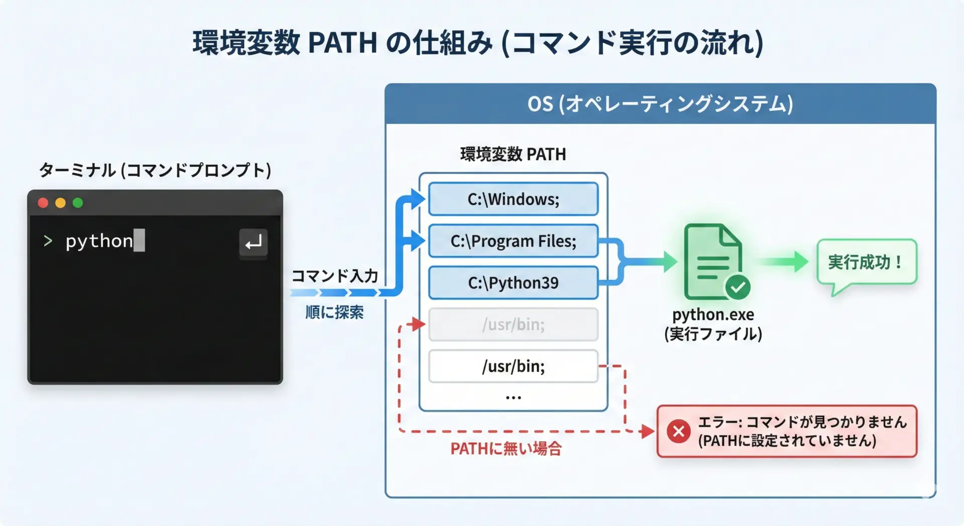 PATHとは、コマンドを実行するときにOSが「どのフォルダを探すか」を決めている環境変数です。