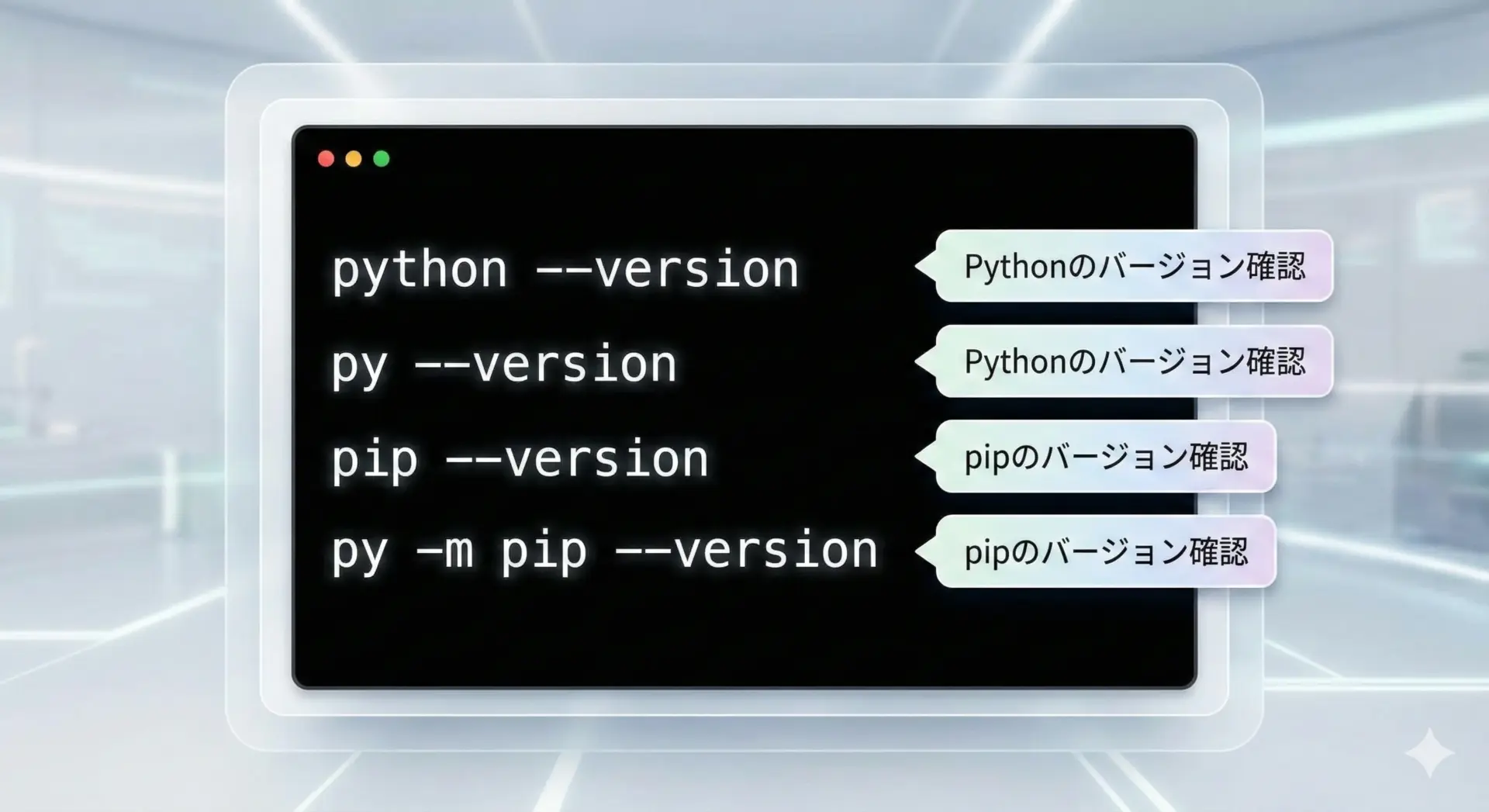 Windowsではpy -m pip --version、Macではpython3 -m pip --versionを試すこともあります。