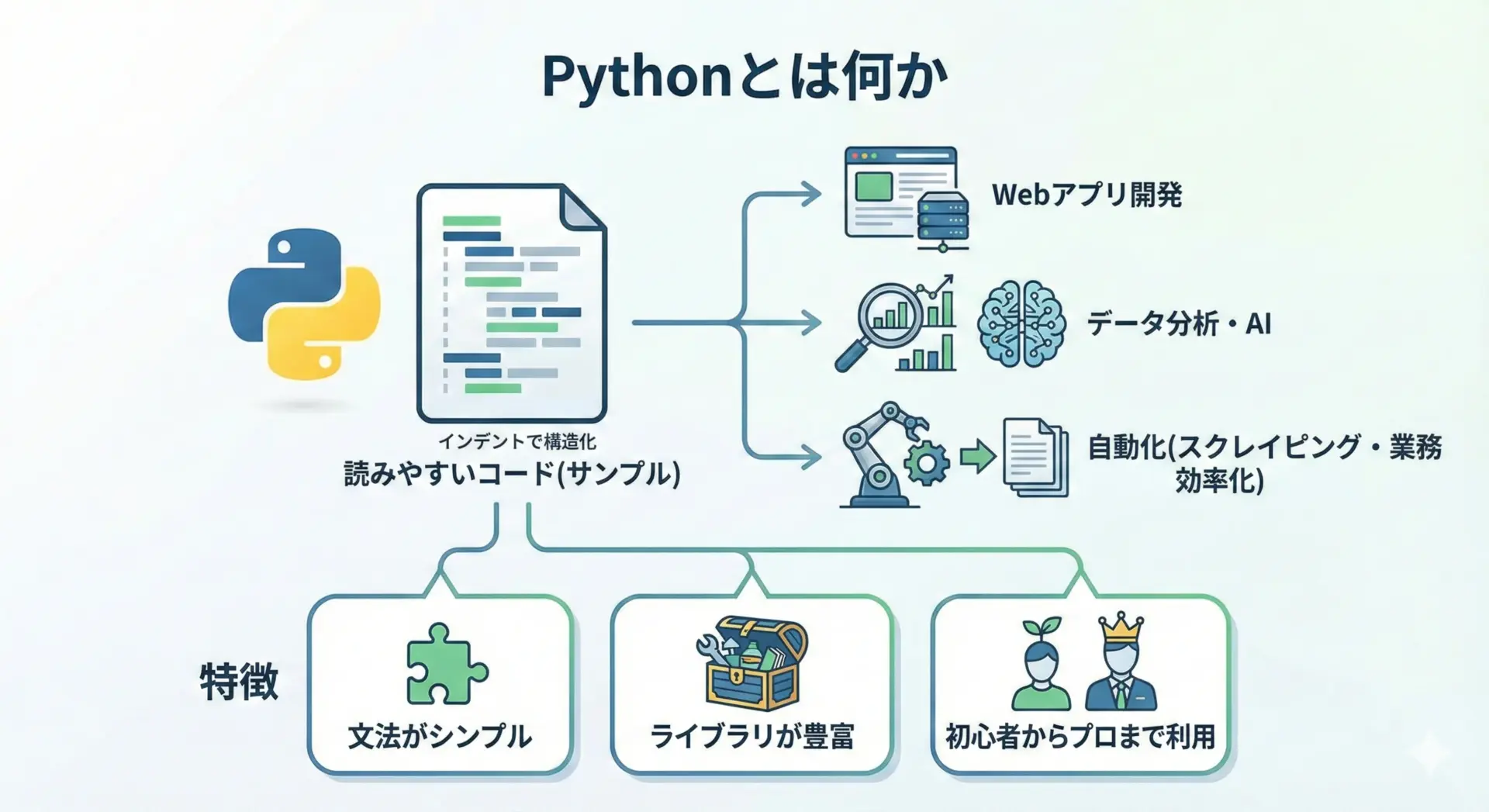 Pythonは文法がシンプルで読みやすく、世界中で利用されている人気のプログラミング言語です。