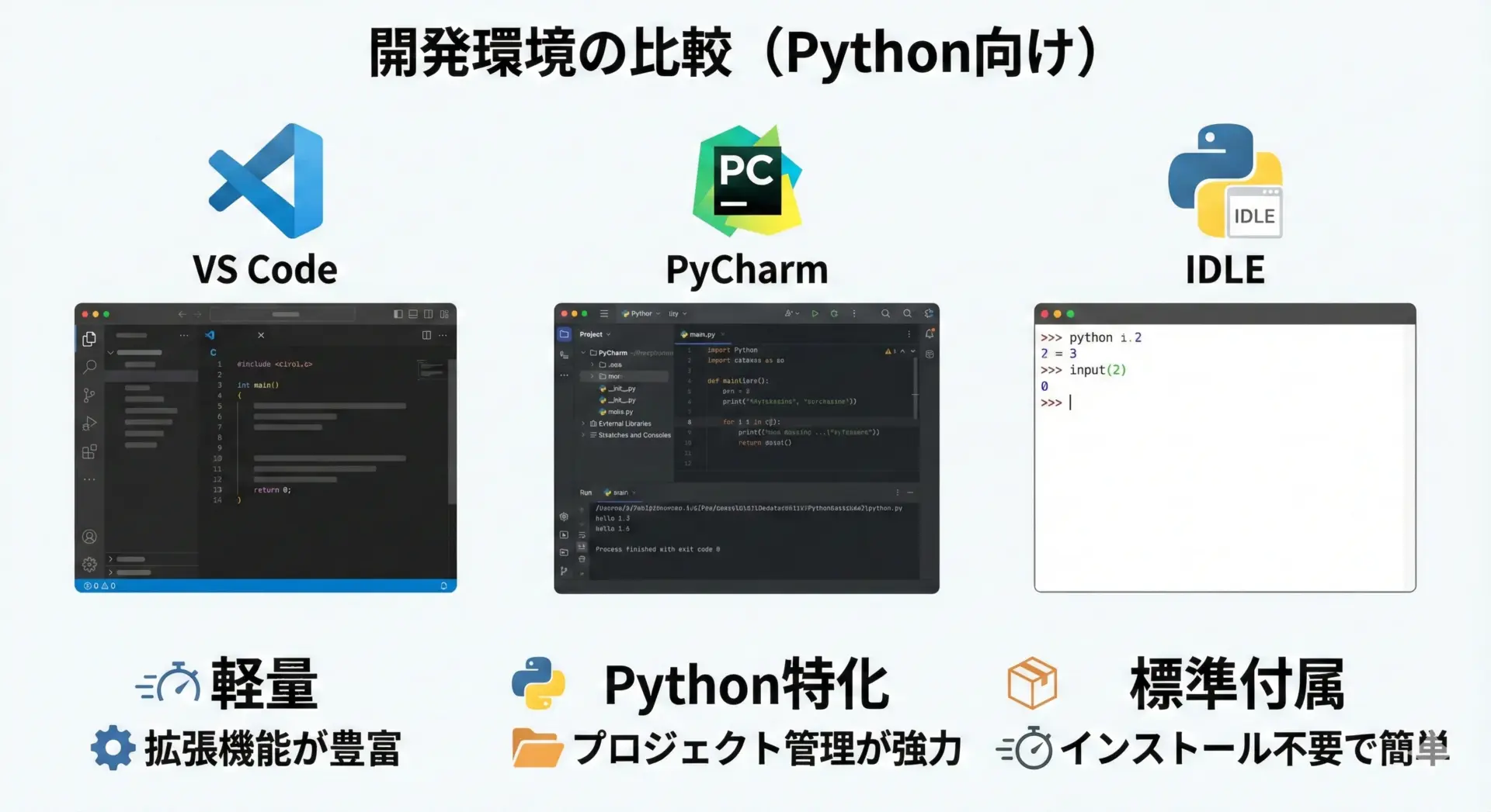 まずはVS Code + Python拡張機能か、インストール直後であればIDLEで簡単なプログラムを書き始めるとよいでしょう。