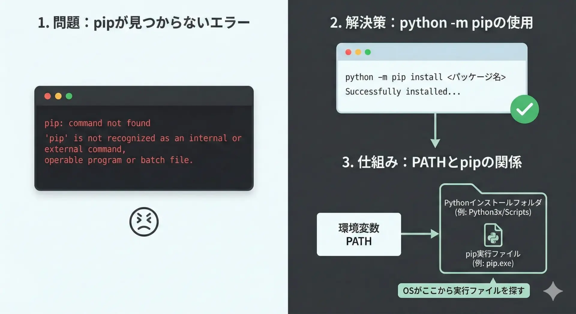 Python本体は動くのに、pipが使えない、あるいは見つからないというトラブルはよくあります。