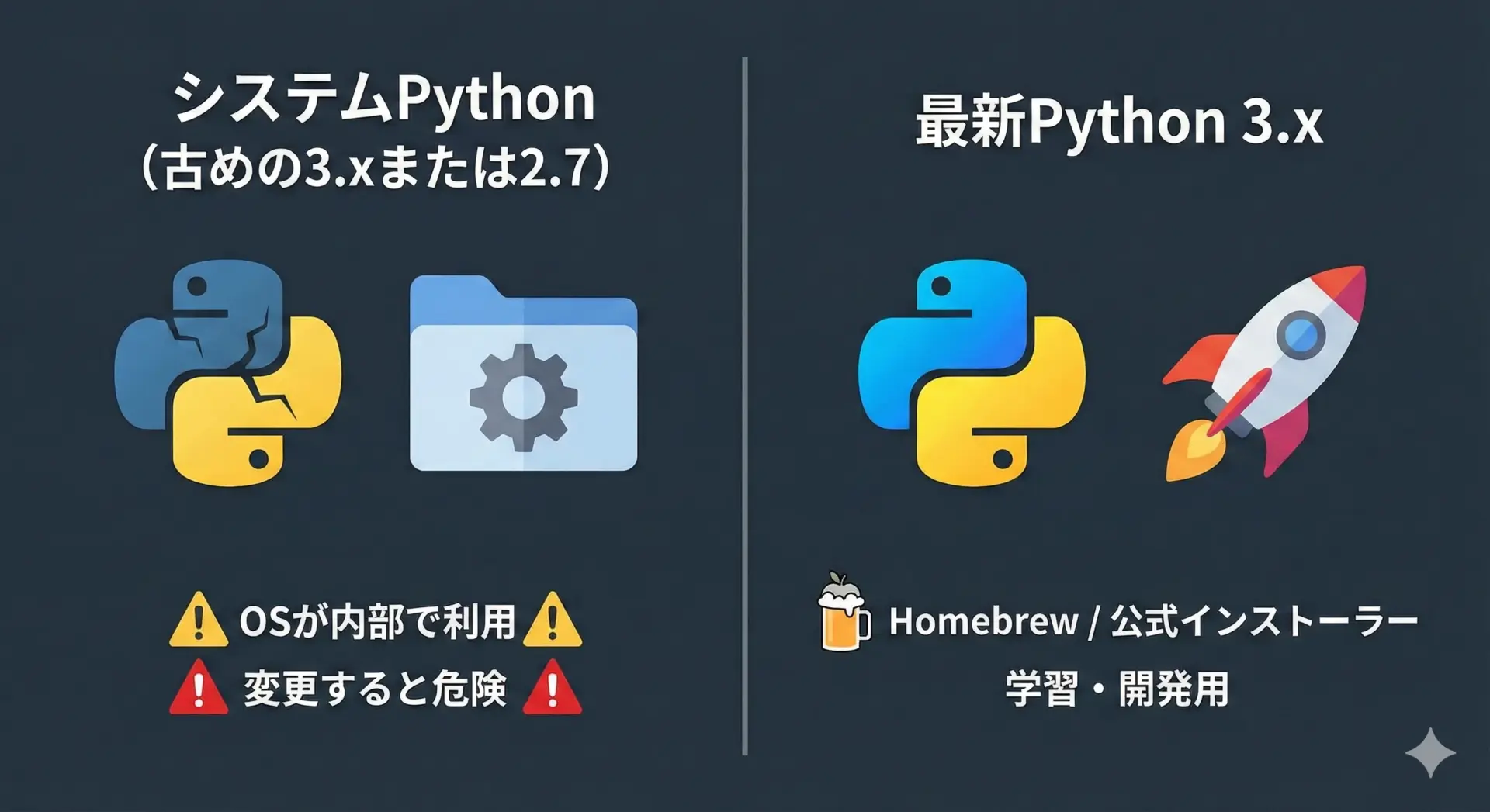 • 古い教材やサンプルコードがPython 2で書かれている場合がありますが、Python 2はすでに公式サポートが終了しているため新規での利用は避けるようにします。
