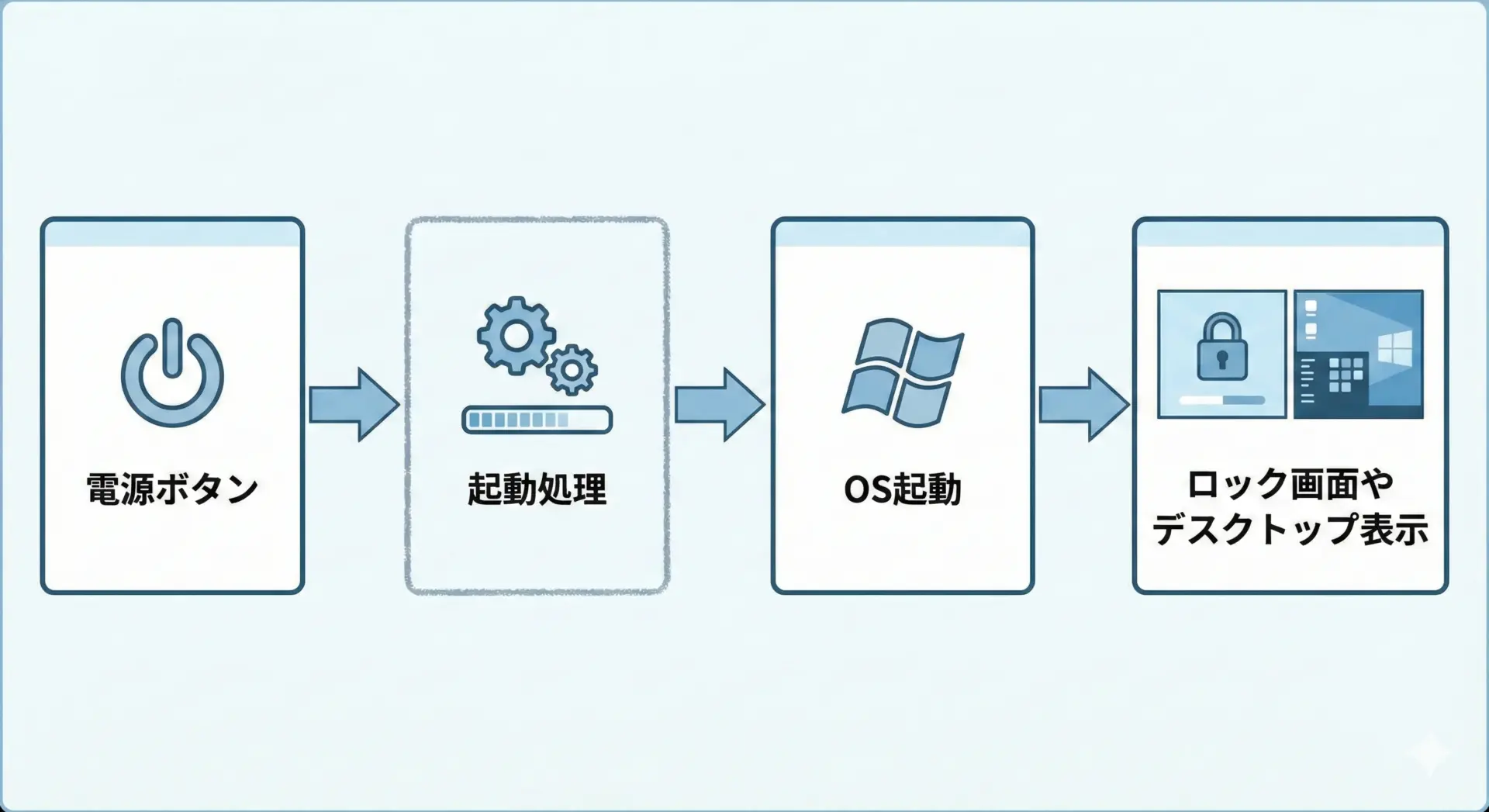 パソコンやスマホが電源を入れた瞬間から動き出す流れを、OSの視点で簡単に追ってみます。