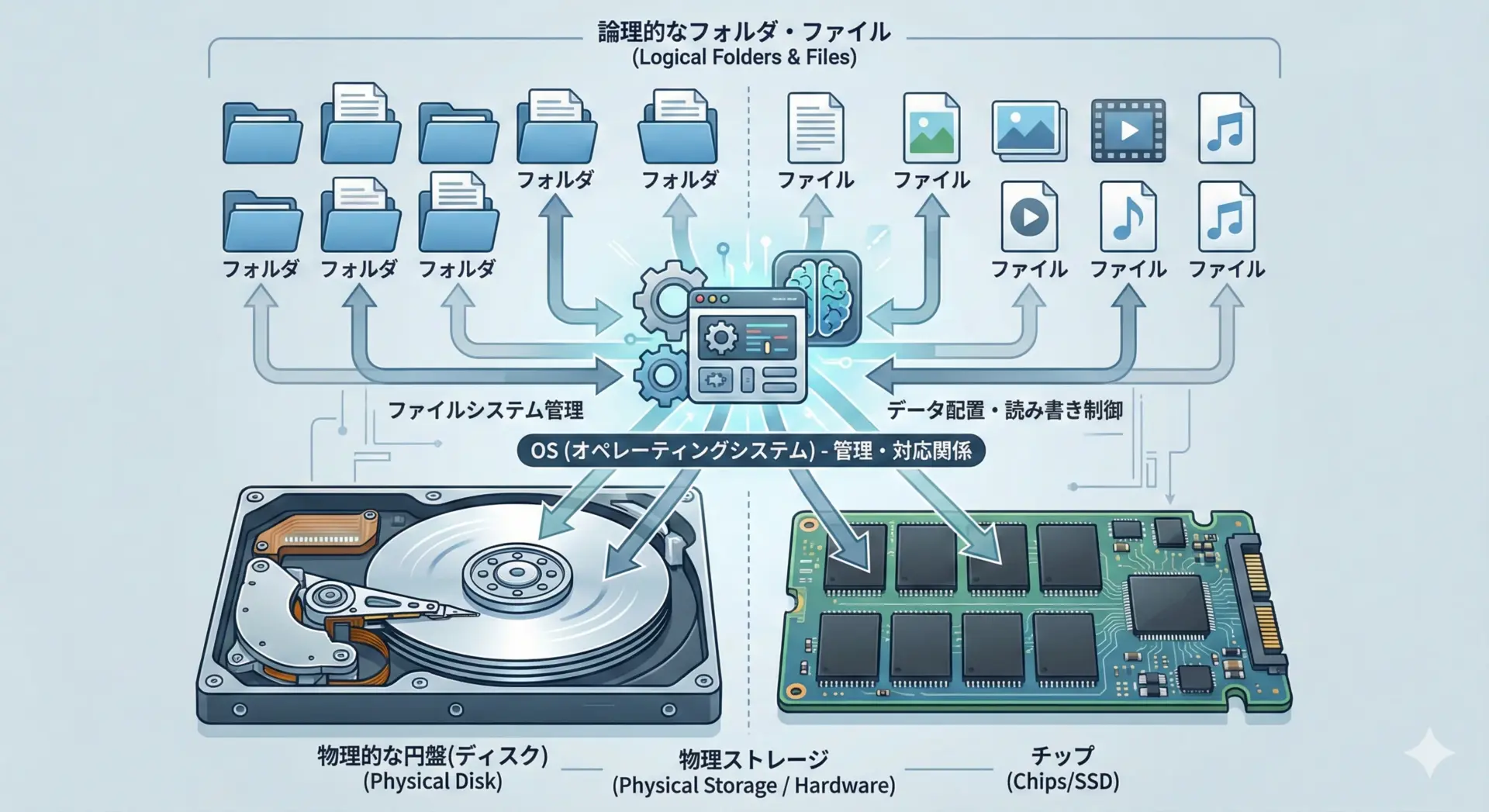 アプリは、実際の円盤のどの位置に書くかなどは気にせず、"/user/photos/2025/abc.jpg" のようなファイルパスをOSに渡すだけで済みます。