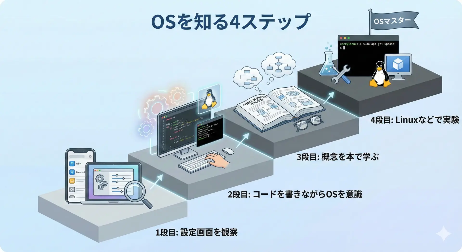 - 少し慣れてきたら、OSの入門書や解説記事で「プロセス」「スレッド」「メモリ管理」「ファイルシステム」などのキーワードを押さえる