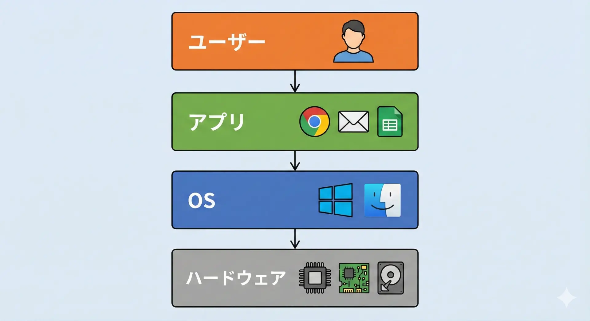 ユーザーは、OSを直接操作しているつもりでも、実際には「OSを通してハードウェアを間接的に動かしている」と考えるとイメージしやすくなります。