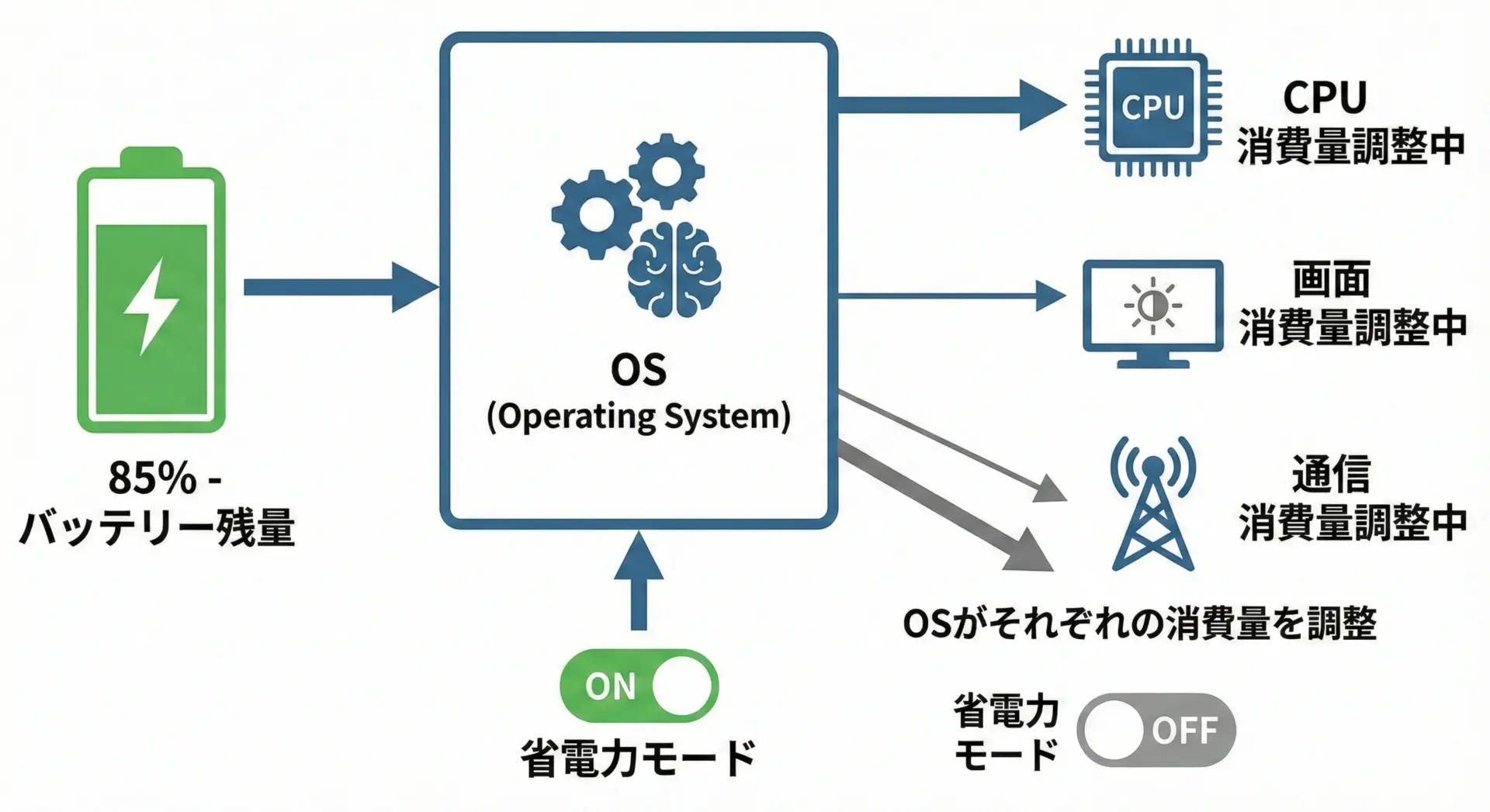 スマホやノートPCで、画面が自動で暗くなったり、使っていないアプリが勝手に停止したりするのは、OSがバッテリー消費を抑えるように調整しているからです。