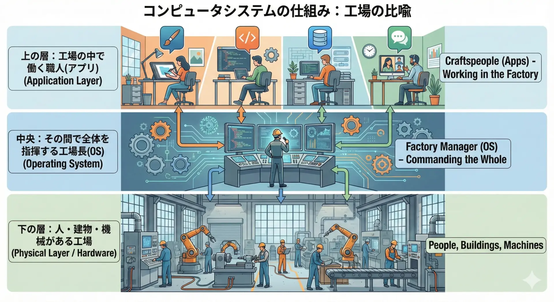 - 工場長(OS)が、機械(ハードウェア)の操作指示を出し、職人(アプリ)からの要求を取り次いでいるイメージ。