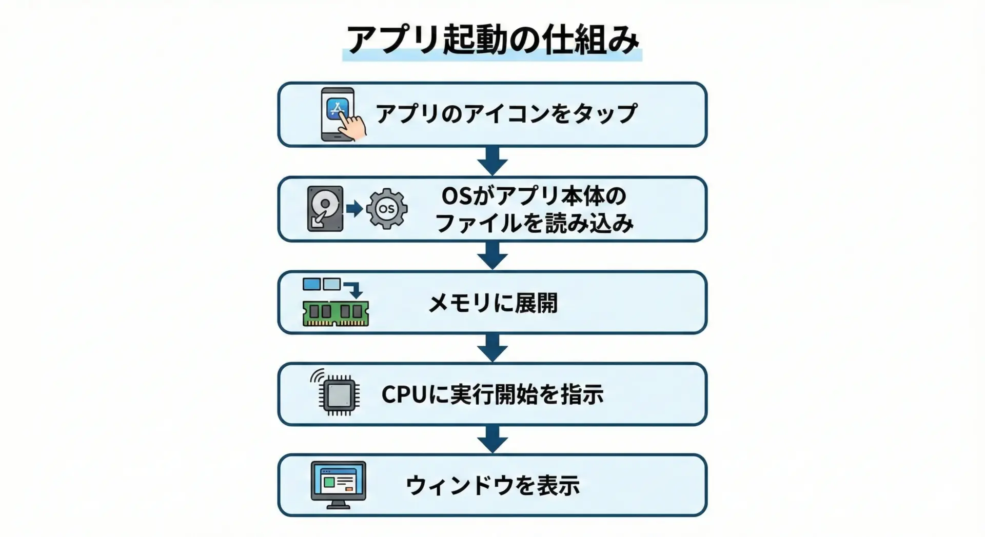 ユーザーは「タップしたらアプリが出てきた」としか見えませんが、その間にOSが「読み込み」「準備」「実行開始」の一連の仕事を一気にこなしていると考えると、OSの存在感がイメージしやすくなります。